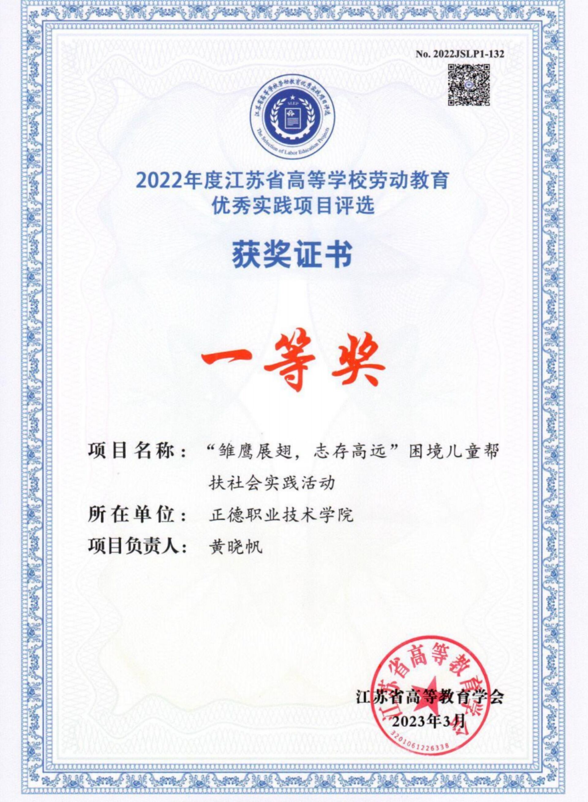 为全面贯彻党的教育方针,努力构建德智体美劳全面培养的教育体系,推进劳动教育实施,总结推广先进经验和有效做法,江苏省高等教育学会在省教育厅指导下,面向全省各高校组织开展2022年度江苏省高等学校劳动教育优秀实践项目评选,经学校推荐、专家会评,户外露出 申报的《”雏鹰展翅,志存高远“困境儿童帮扶社会实践活动》项目荣获一等奖。