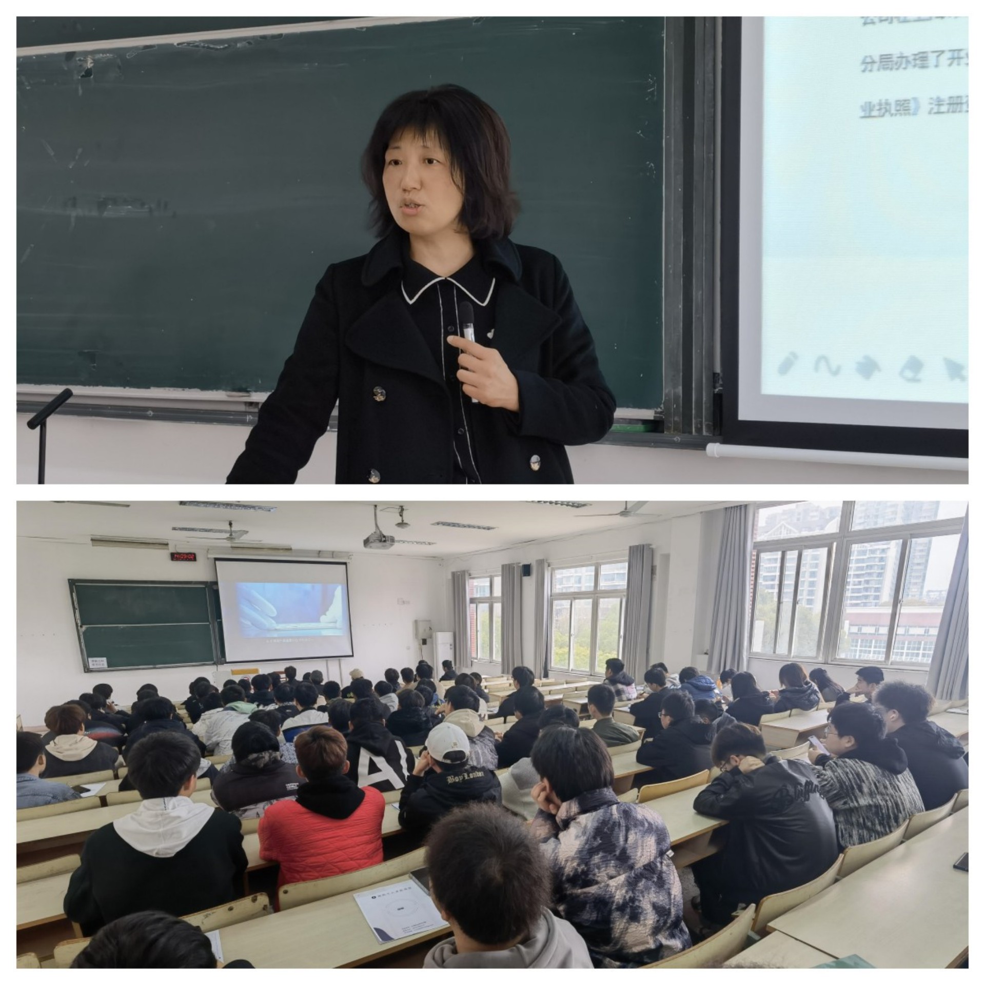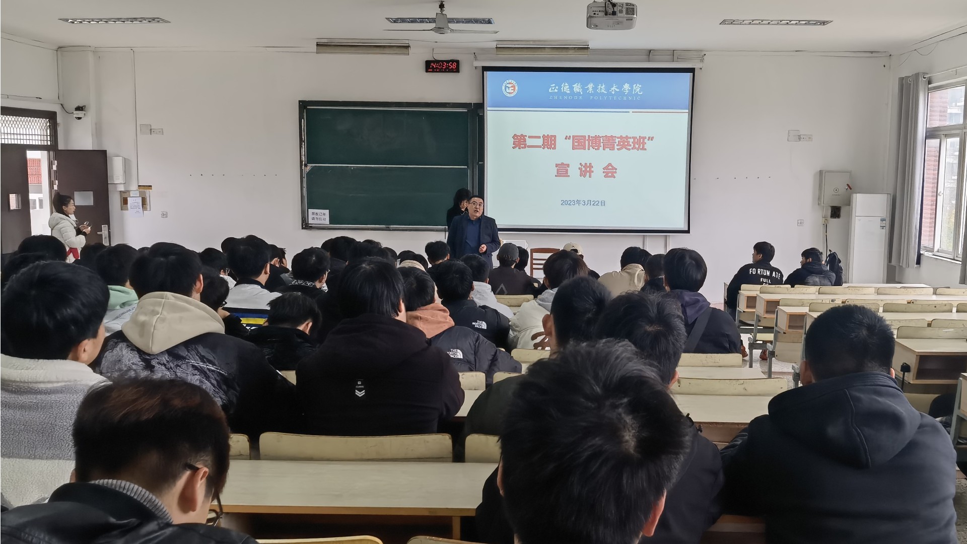 韦静以视频的形式展现了公司的成立背景、发展状况和取得成就等,随后从招聘对象、招聘条件、薪资待遇、职业生涯规划等方面向同学们作了详细介绍。她在介绍中强调,国博菁英班是正德学院与国博公司产教一体、校企一体、工学一体联合培养未来高素质技能人才的新模式、新理念、新实践,将以服务国家战略需求为牵引,锻造具备工匠精神,精操作、懂工艺、会管理、善协作、能创新的能工巧匠、大国工匠为目标。