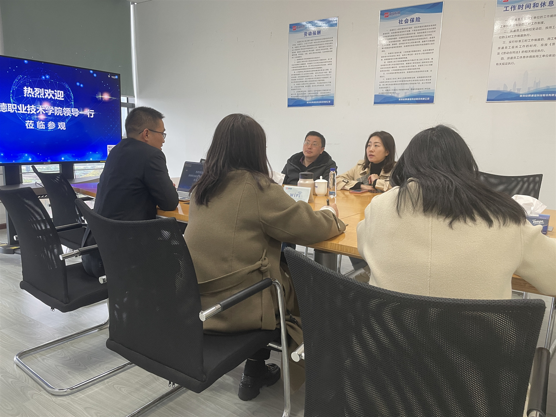 为进一步深化产教融合、拓宽毕业生就业渠道,4月4日下午,电子与信息技术系副主任(主持工作)刘佳带队赴南京欣网通信科技股份有限公司开展“访企拓岗”调研,专业教师张韬、茹志鹃等参加活动。