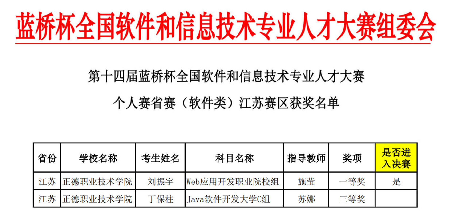 在第十四届“蓝桥杯”个人赛省赛(软件类)江苏赛区中,电子与信息技术系软件技术专业2021级学生刘振宇获省级一等奖、丁保柱获省级三等奖。其中,Web应用开发项目为户外露出 首次参赛,获得历史性的突破,并闯入全国总决赛。