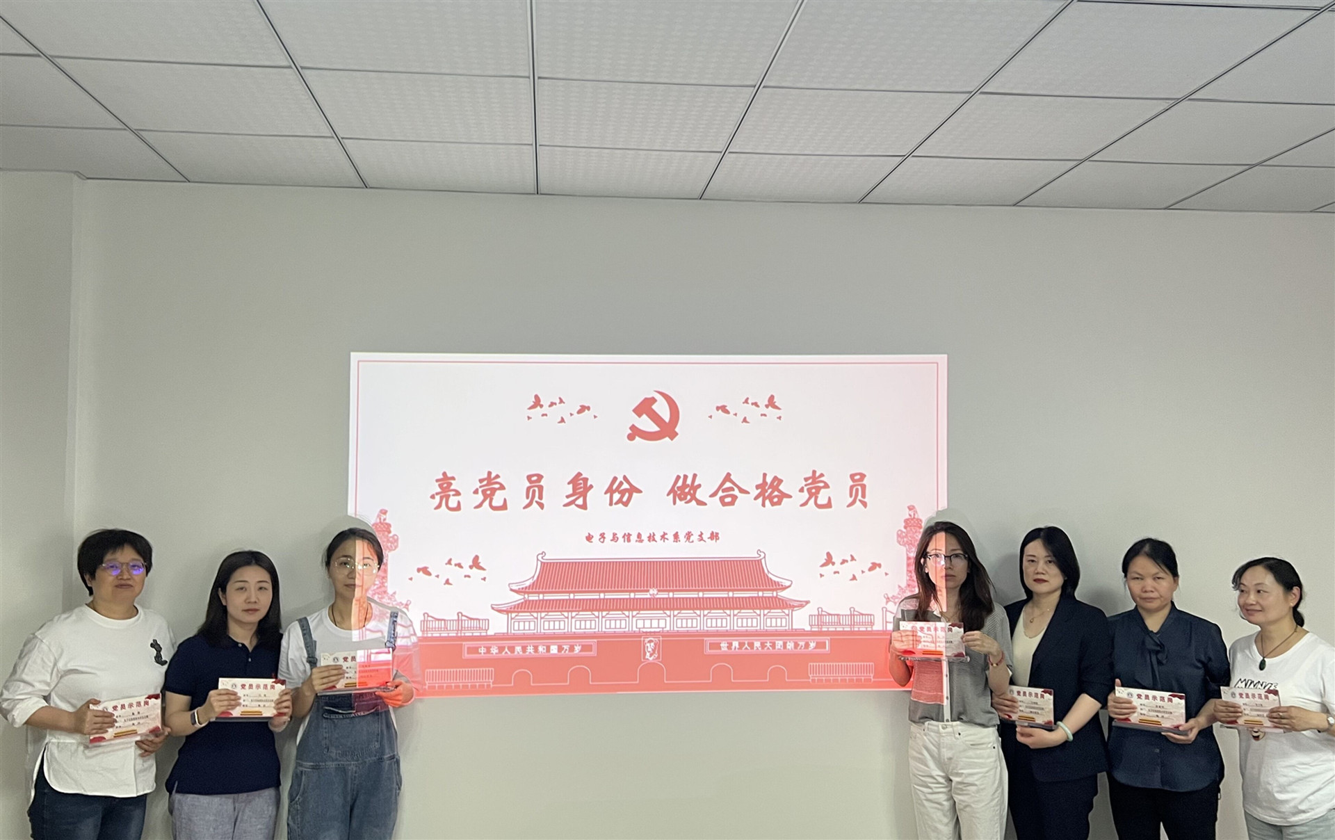 近期,为加强电信系教师党员和辅导员队伍建设,强化宗旨意识、服务意识、责任意识和奉献意识,提高履职尽责能力,电子与信息技术系对全系教工党员开展了挂牌亮身份活动,让“红色名片”不断被擦亮。有效推动党员的身份“亮”起来、作用“强”起来、形象“树”起来,激励广大教工党员勇挑新担当,营造出比学赶超的浓厚氛围。
