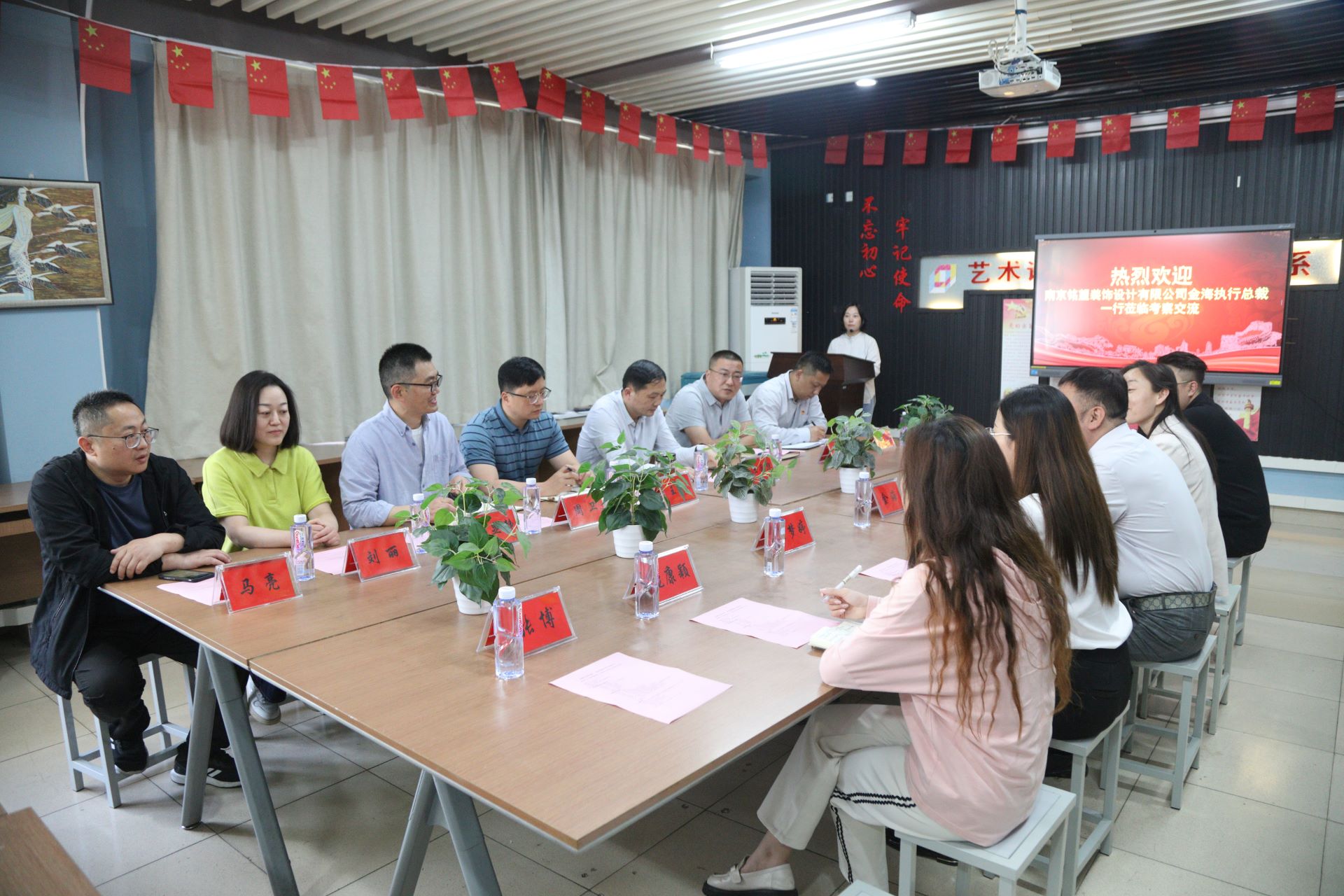 南京铭望装饰设计有限公司(以下简称铭望装饰)执行总裁金海、副总经理兼公司党支部书记王雪璐、人事行政经理吕梦婷、设计部经理冯海及随行宣传企划工作人员;户外露出 江爱华副院长、教务处长王俊、教务处副处长兼校企办主任陆松、艺术设计与建筑工程系副主任周卫(主持工作)、副主任兼党支部书记陈宏波、建筑与装饰教研组长冯显静及相关专业负责人共同出席了本次颁奖仪式和交流会。会议由周卫主持。