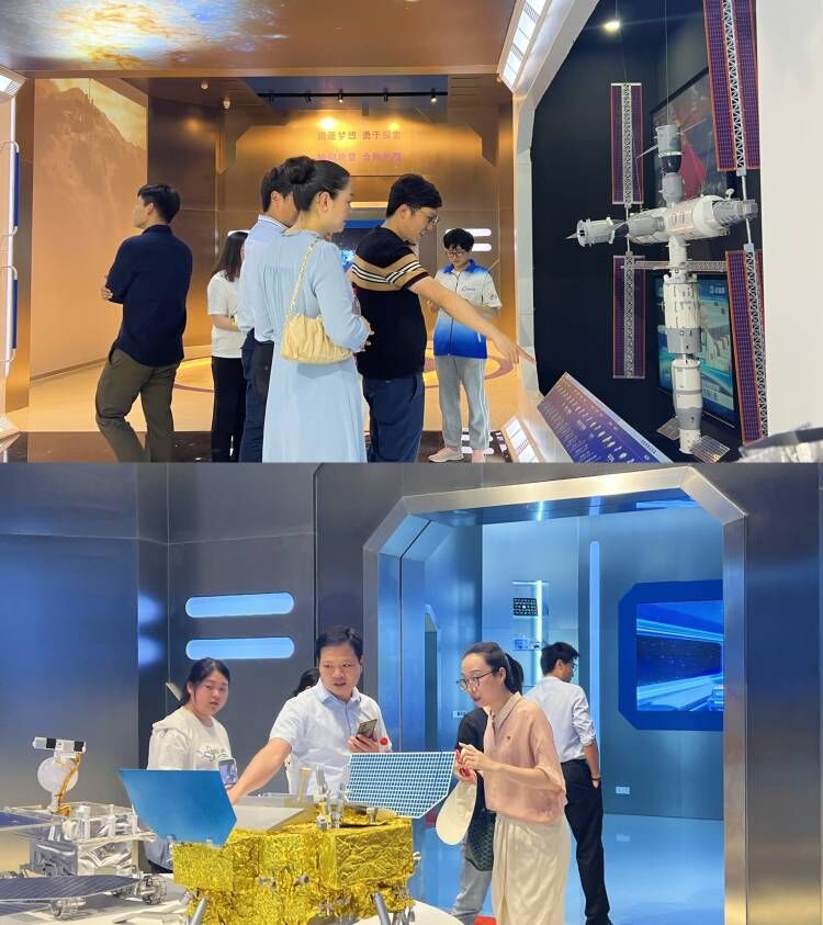 第二站是航天教育教学实践基地,基地陈列着高分一号遥感卫星、嫦娥系列登月探测仪、悟空号暗物质卫星探测仪等卫星模型,在志愿者的讲解下,党员同志们了解了我国航天工程的发展历程、航天“星、箭、弹、船、器”的研制型谱、发展历程等,深刻感悟“两弹一星”精神等航天精神谱系,共同探索依托实景基地提升思政育人活力和实效性的模式。