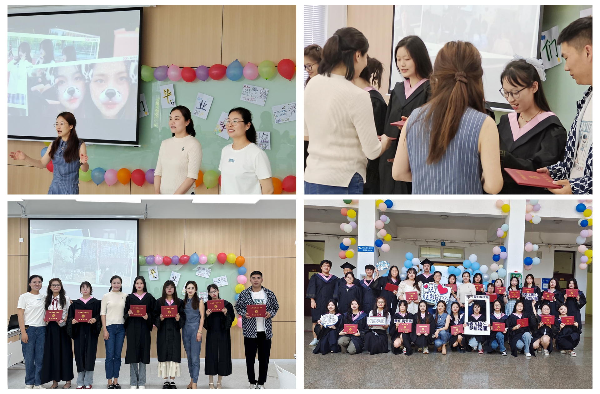 随后,支部书记杨春娟为欢送会致辞,她充分肯定了2023届毕业生在校期间的优异表现,对全体毕业生克服重重困难、圆满完成学业成长成才感到欣慰,她衷心祝福同学们鹏程万里、前程似锦,梦想成真,不负青春年少!接着系主任杨晶,杨春娟以及辅导员沈言静为同学们颁发毕业证书。