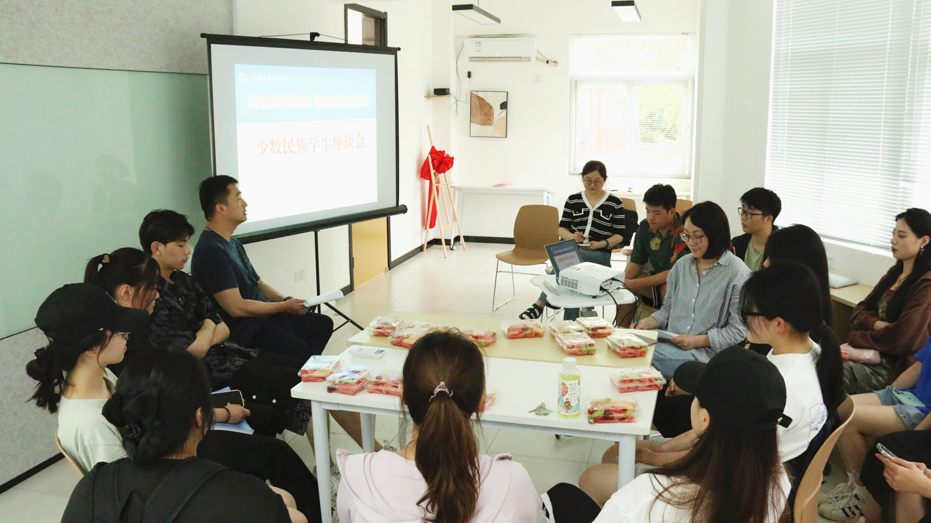 会上,毛茂邀请少数民族学生做了自我介绍,并就学生们在校期间的学习生活情况做了了解。少数民族学生就自己在学院的所学所感谈了体会,并对学院为他们提供良好的学习生活环境表示感谢。随后,周慧与同学们亲切交谈,并带领同学们围绕我国民族政策、少数民族优秀人物事迹以及如何维护民族团结进行了分享学习,座谈会现场气氛温馨而融洽。