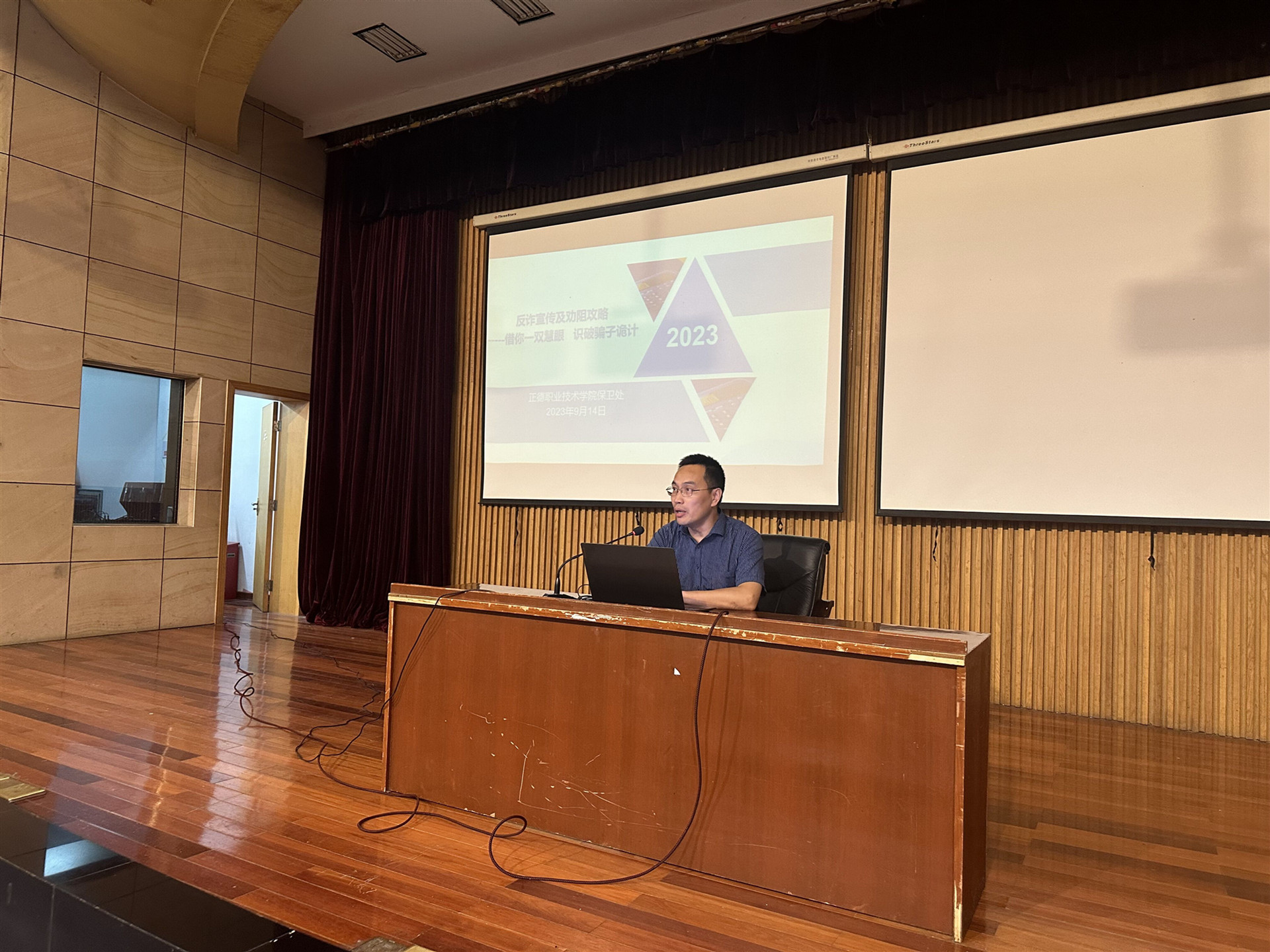 为了提高学生的反诈防诈能力,强化学生的法治观念和自我保护意识,营造平安、文明、和谐校园,9月14日晚,电子与信息技术系邀请学院保卫处副处长丁胜为2023级新生讲述了一堂生动的反诈防骗讲座。