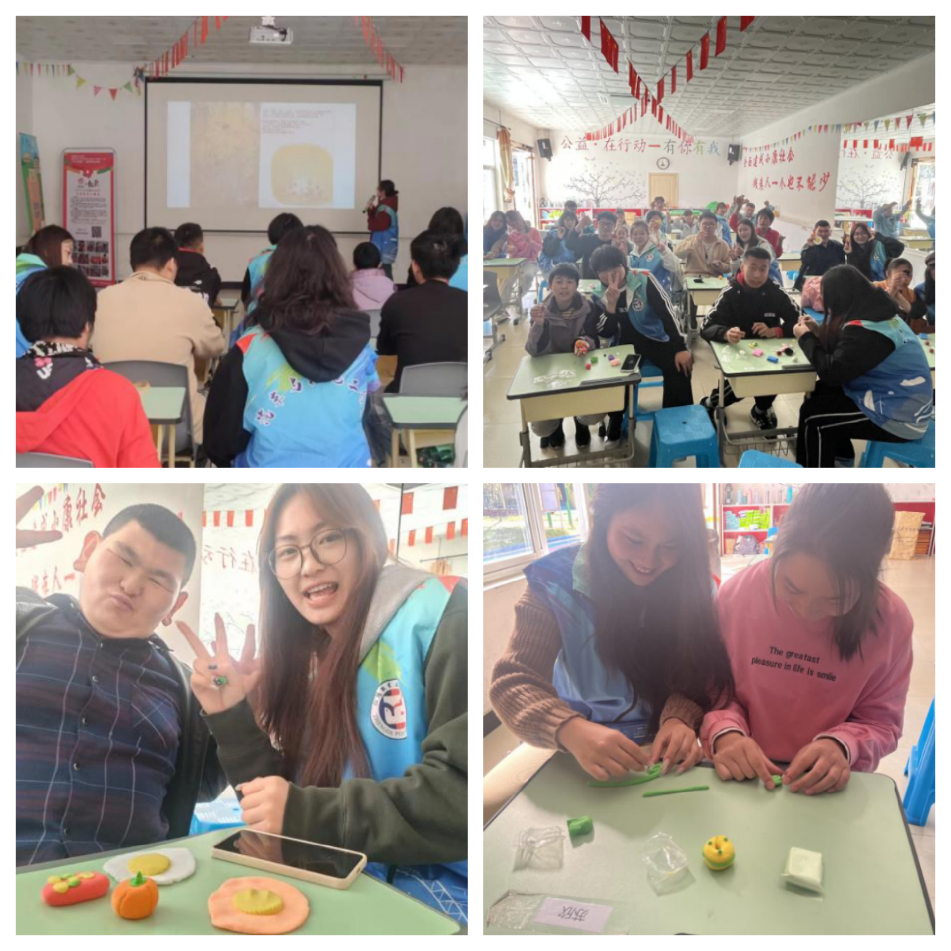 其次,在手工课上志愿者和孩子们一起利用黏土做出各式各样“食品”。手工课旨在培养孩子们的动手操作能力,同时也培养孩子们思维能力,开拓创新能力,充分发挥孩子的想象力,以及积极思考的能力。同时,也告诫孩子们要珍惜粮食、反对浪费。