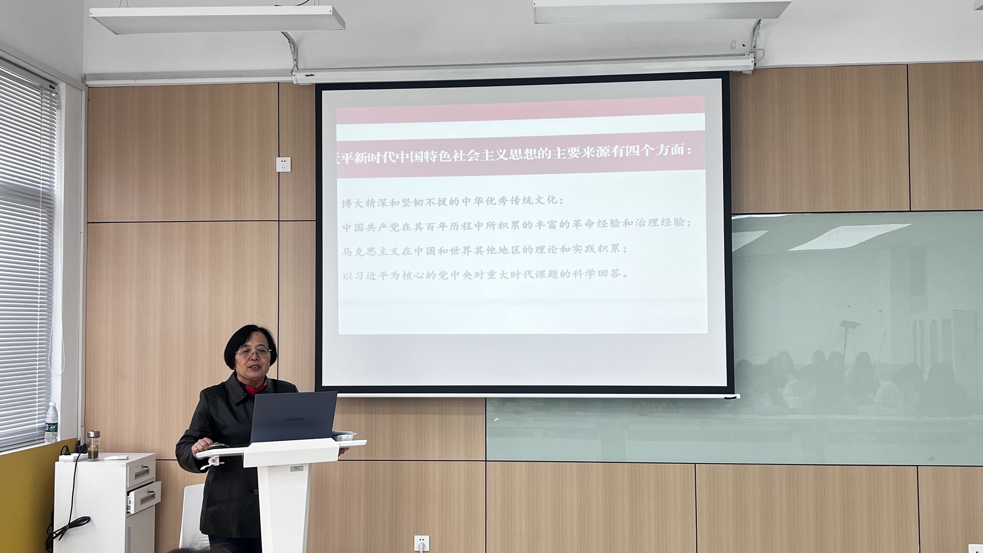 苗秀娟教授结合《习近平新时代中国特色社会主义思想概论》课程内容——习近平新时代中国特色社会主义思想的主要来源,从博大精深和坚韧不拔的中华优秀传统文化、中国共产党在其百年历程中所积累的丰富的革命经验和治理经验、马克思主义在中国和世界其他地区的理论和实践积累、以习近平为核心的党中央对重大时代课题的科学回答这四个方面,为学生认真的作宣讲,加深了学生对理论的认知,提升了学生的思想觉悟。