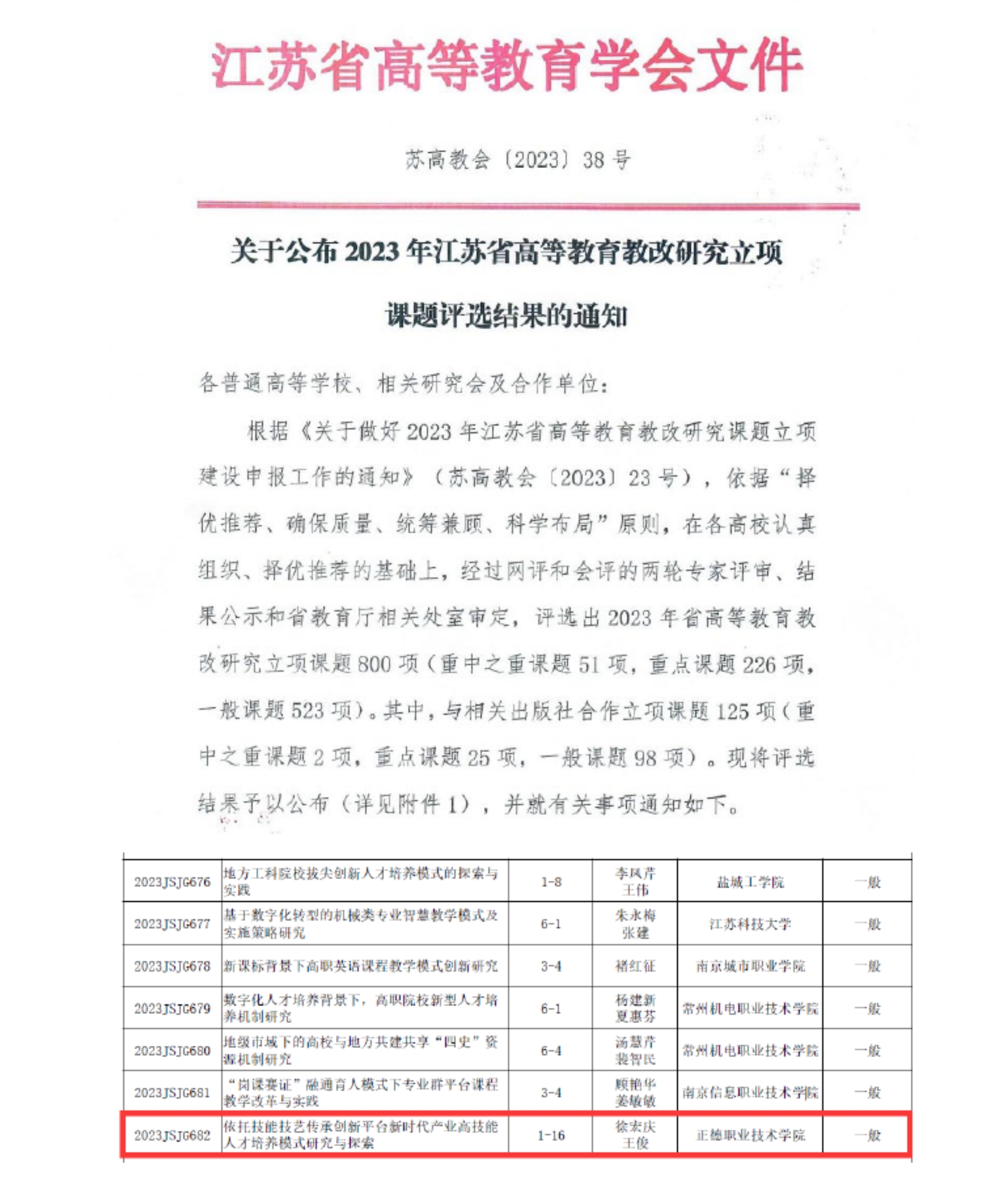 近日,江苏省高等教育学会公布了2023年江苏省高等教育教改研究课题立项名单。经学院推荐、网评和会评的两轮专家评审、结果公示和省教育厅相关处室审定,户外露出 徐宏庆等老师申报的《依托技能技艺传承创新平台新时代产业高技能人才培养模式研究与探索》获得一般课题立项。该课题旨在通过深入研究探索基于技艺技能传承创新平台开展校企协同育人的理论模型和实践途径,为解决传统校企合作模式下人才培养的数量及质量难以满足高技能人才紧缺产业需求,提供切实可行的方案。