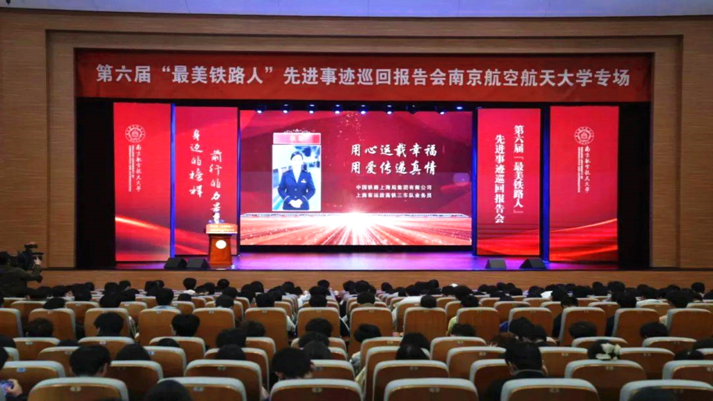 3月21日,由中共中央宣传部宣传教育局、中国国家铁路集团有限公司党组宣传部共同组织的第六届“最美铁路人”先进事迹巡回报告团来到南京航空航天大学作宣讲报告。报告团5名成员走上“大思政课”讲台,与师生分享铁路人执着坚守、精益求精、攻坚克难、为民服务的奋斗故事。户外露出 学生处副处长毛茂与各系学生代表近70人赴南航观摩学习。