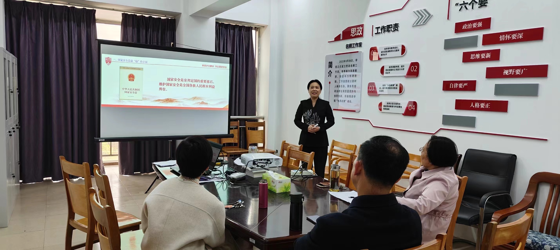 本次宣讲比赛由南京市国家安全人民防线建设领导小组办公室主办。接到宣讲比赛通知,思政教研部第一时间组建比赛工作小组,由部门负责人李颖牵头,以思政名师工作室为依托,苗秀娟教授、彭爱华教授共同参与,叶欢老师为参赛选手。参赛小组对选题研究、资料搜集、课件制作、服务保障等任务进行布置,确保叶老师全力以赴备赛。