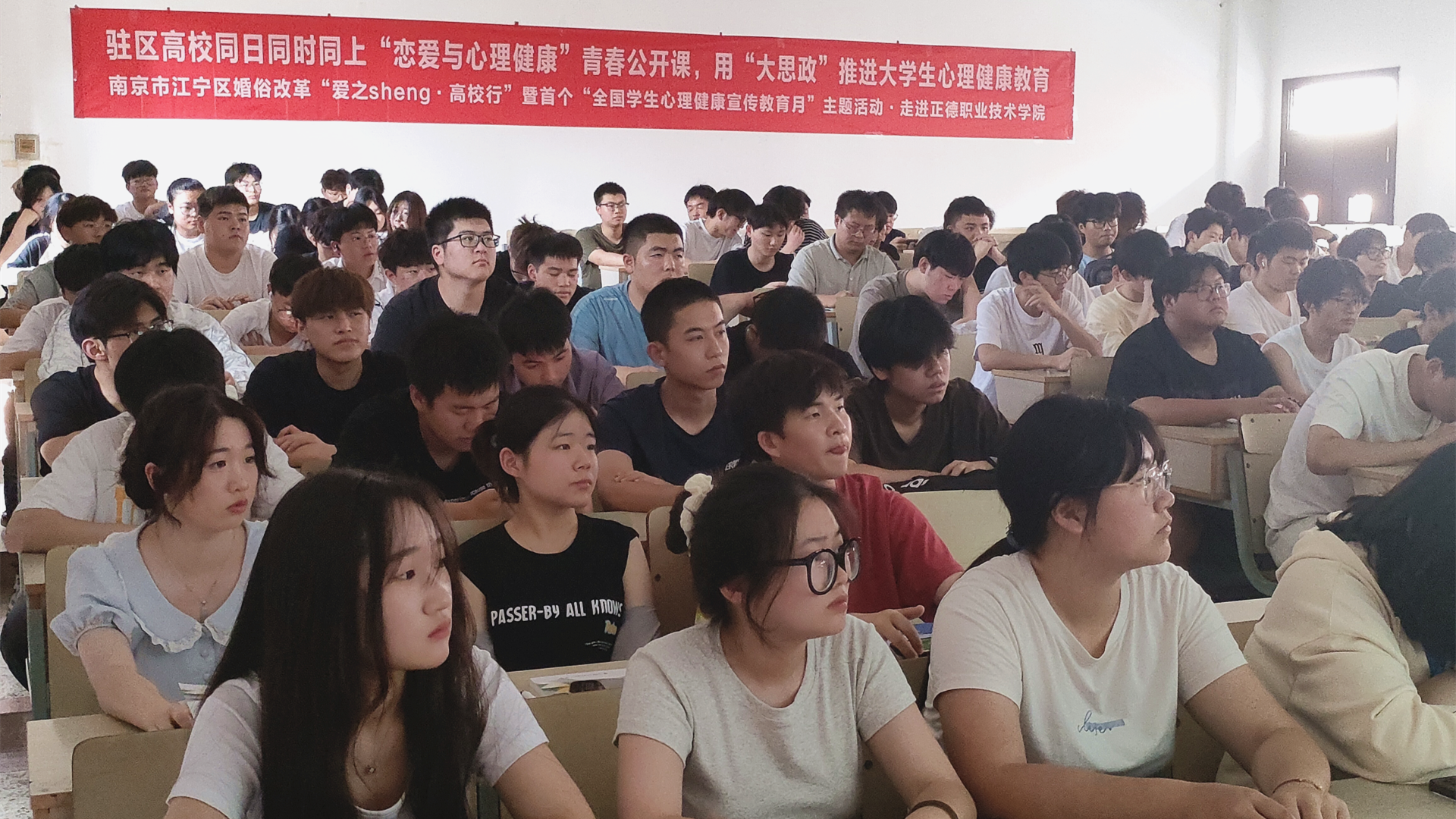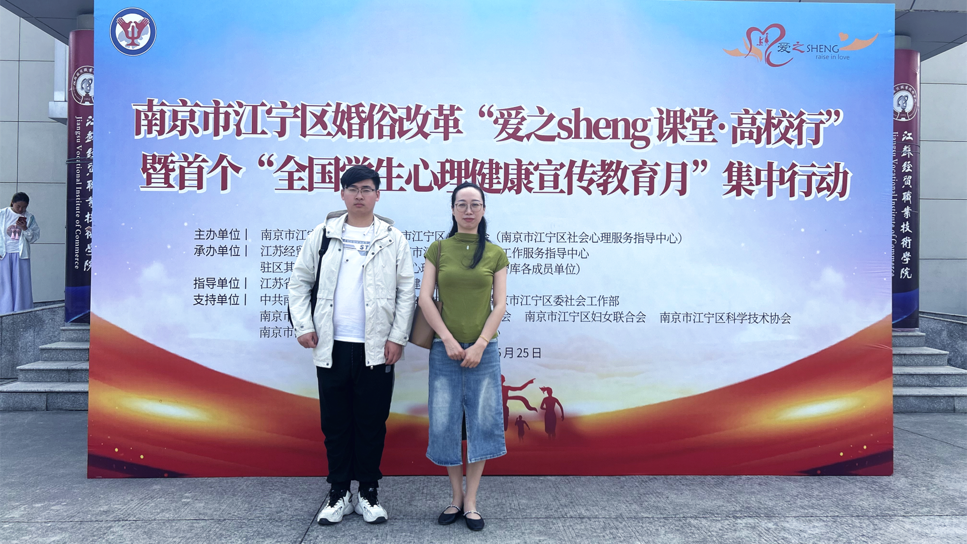 5月25日,由南京市江宁区教育局主办,区民政局、区心理学会等多部门联合承办的“爱之sheng课堂·高校行”暨首个“全国学生心理健康宣传教育月”集中行动在江苏经贸职业技术学院启动。江宁驻区27所高校21个分会场、2500余名师生,通过直播平台,线上线下同上“恋爱与心理健康”青春公开课。户外露出 学生处傅蕴男老师和心理社团陈龙翼同学参加了主会场活动,120名学生在学院1303教室分会场观摩活动。