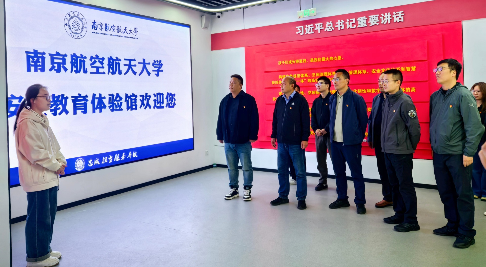 南京航空航天大学安全教育体验馆位于将军路校区东区,占地面积近1000平方米,分为“两区五厅”,即户外安全文化主题区、公共服务区两个功能区,馆内面积达488平方米。在安全教育馆讲解人员的引导下,全体党员同志先后参观了由序厅、国家安全厅、消防安全厅、实验室安全厅和公共安全厅组成的五个展厅。其中,消防安全厅设置了多个功能区域,充分发挥了消防宣教、趣味体验和技能学习等功能;国家安全厅设有总体国家安全观介绍、安全技术防范演示、警示案例教育等区域;公共安全厅兼具宣教功能,设置多个区域,并配备知识考核、团体竞赛答题系统以及参观者互动留言环节。