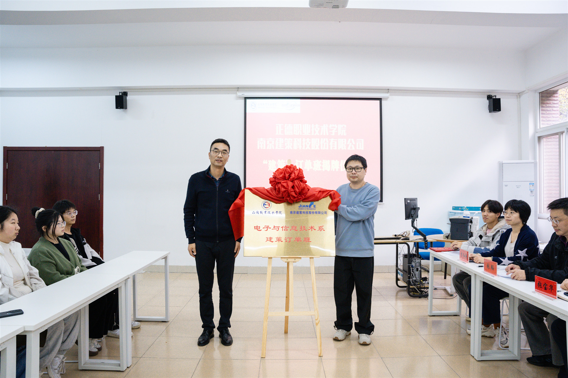 南京建策科技股份有限公司副总经理张林炜、总经理助理刘佳佳,市场部经理陆苗,学院院长助理、招生就业处处长王墀、招生就业处副处长张智灏,电子与信息技术系主任刘佳、副主任张宝华、计算机网络技术专业负责人张韬,专任教师余爱华、李俊、李红艳、辅导员刘敏婧,以及建策订单班全体同学共同见证了这一重要时刻。仪式由张韬主持。