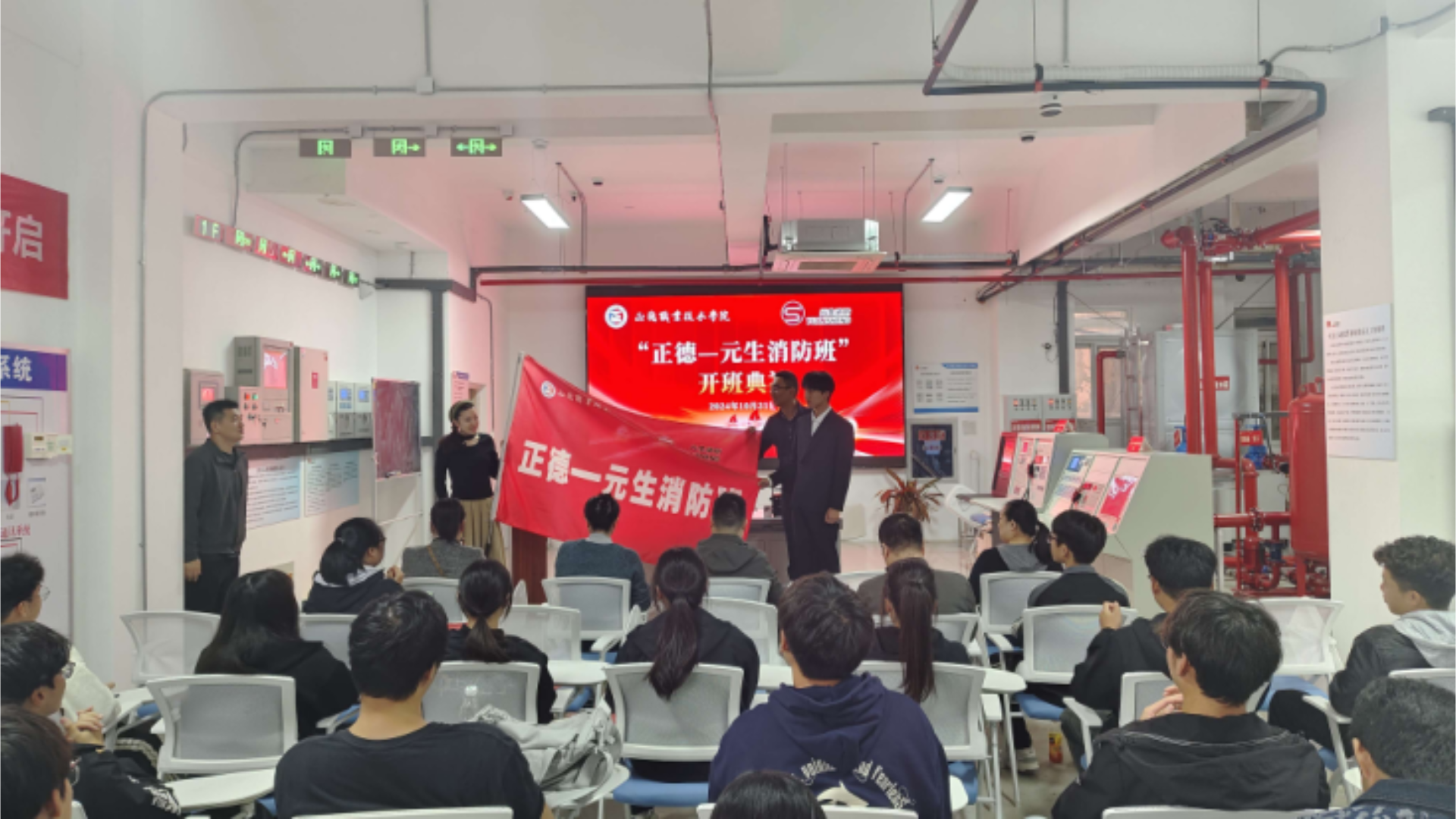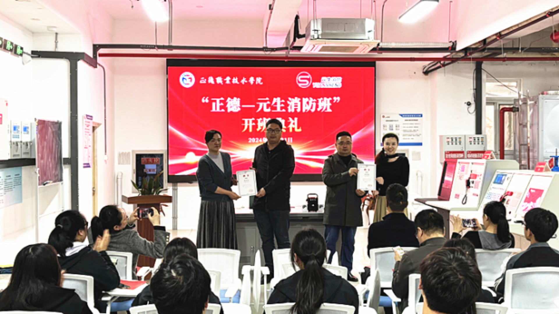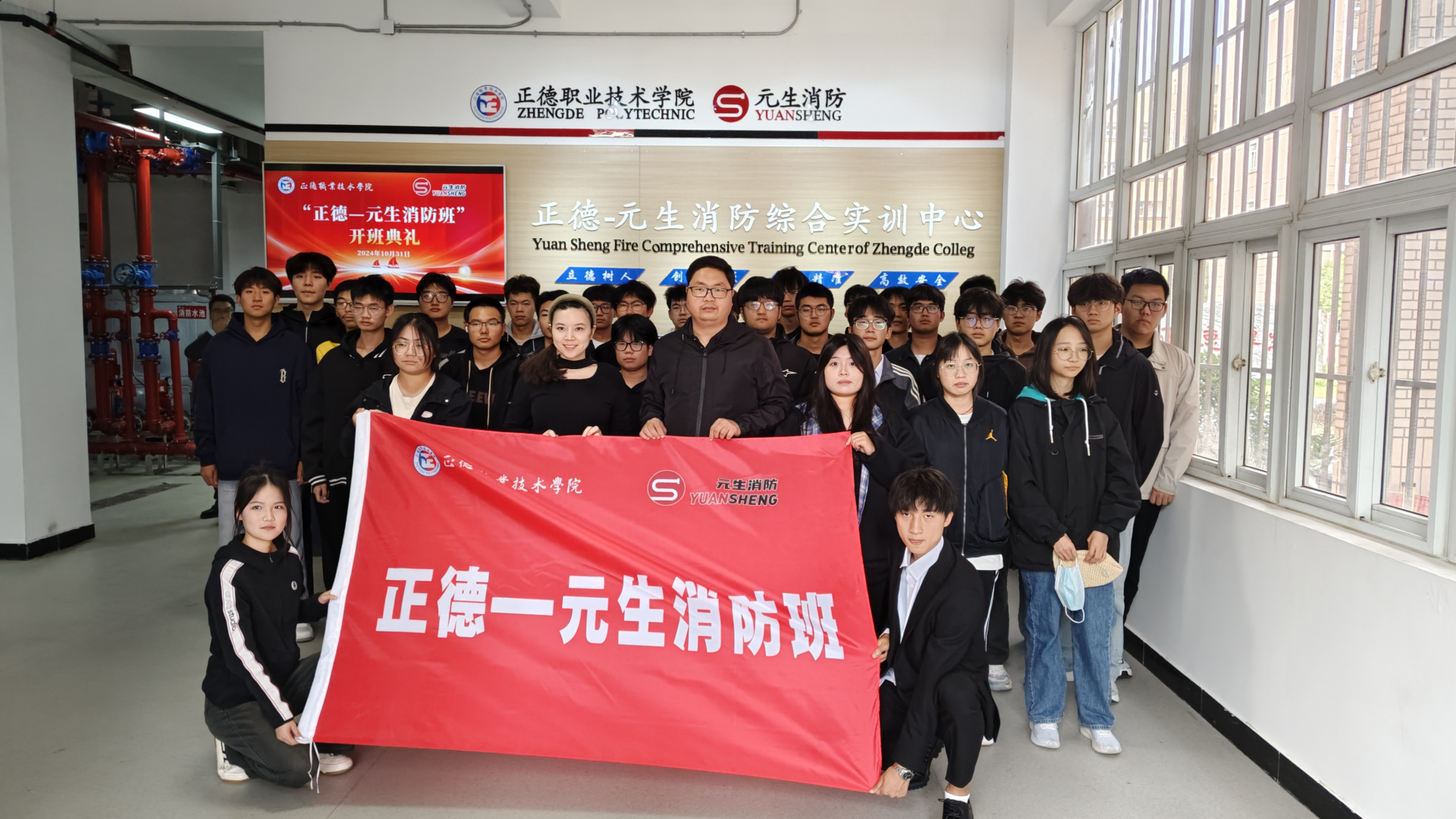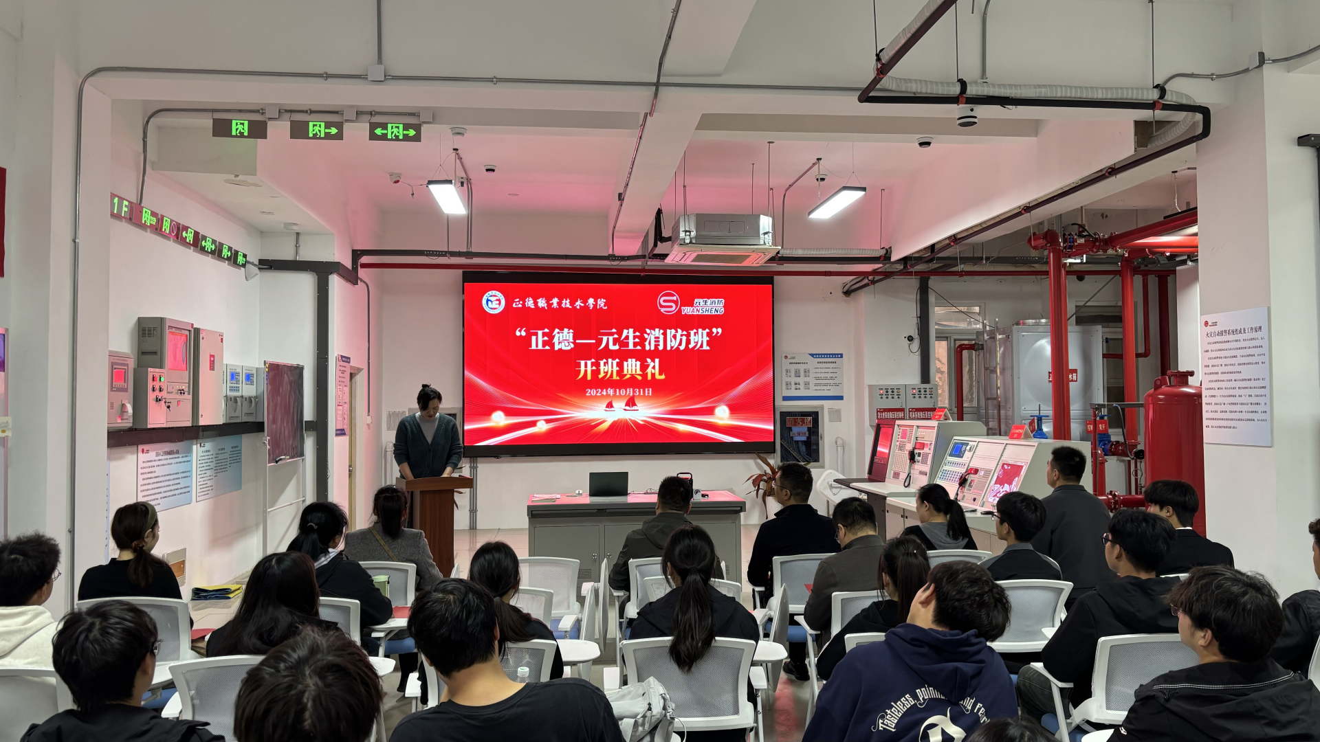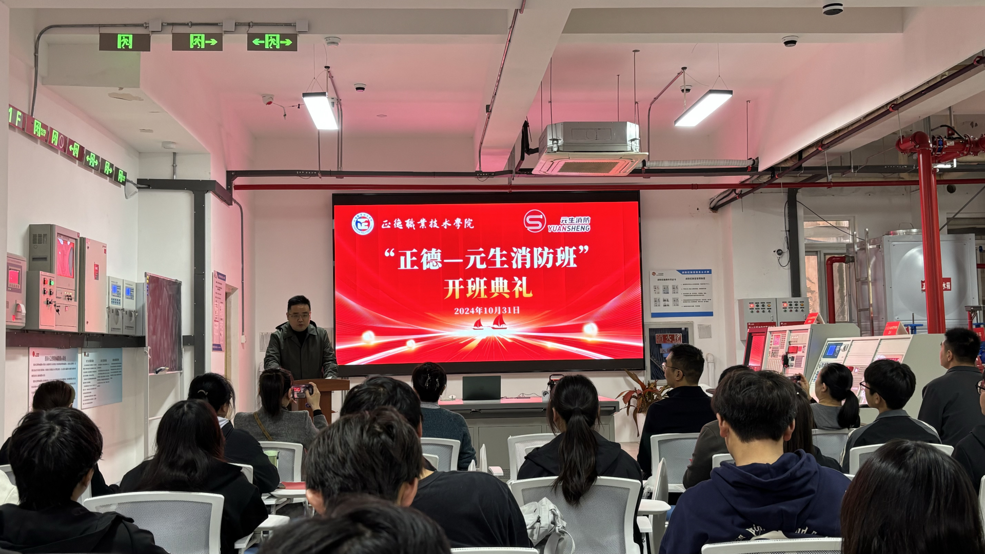 10月31日下午,“正德—元生消防班”开班仪式在正德-元生消防综合实训中心隆重举行。南京元生消防工程有限公司总经理刘臻、副总经理朱雯洁等企业代表、户外露出 院长助理、招就处处长王墀、汽车与机电工程系系主任任丽君等老师出席活动。典礼由汽车与机电工程系系副主任虞骏卿主持。