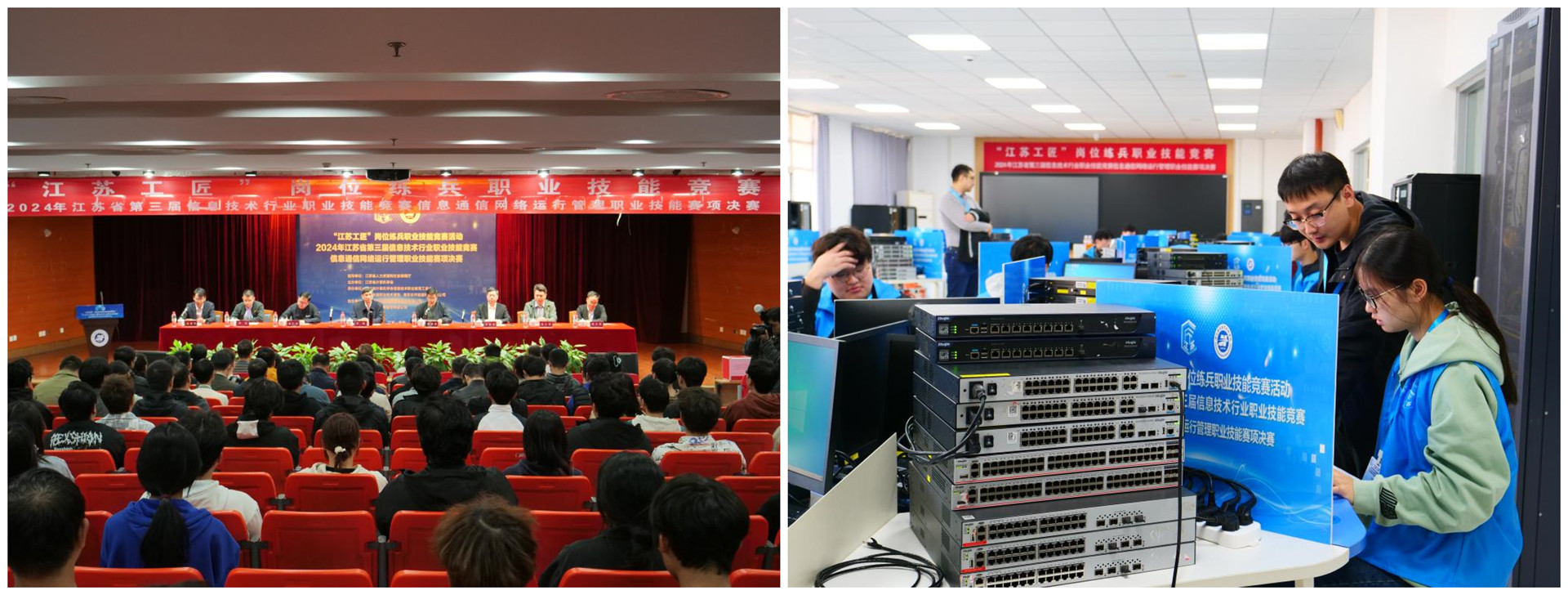 本次比赛由江苏省人力资源和社会保障厅全程指导,信息通信网络运行管理赛项被认定为2024年“江苏工匠”岗位练兵职业技能省级一类竞赛活动。竞赛分为职工(含教师)组和学生组两个竞赛组别均为单人赛,旨在评估参赛者的理论知识和实际操作技能,最终全省各市通过预赛进入本项赛事决赛的共有30位职工和30位学生,户外露出 是全省唯一进入决赛并获奖的民办高校。