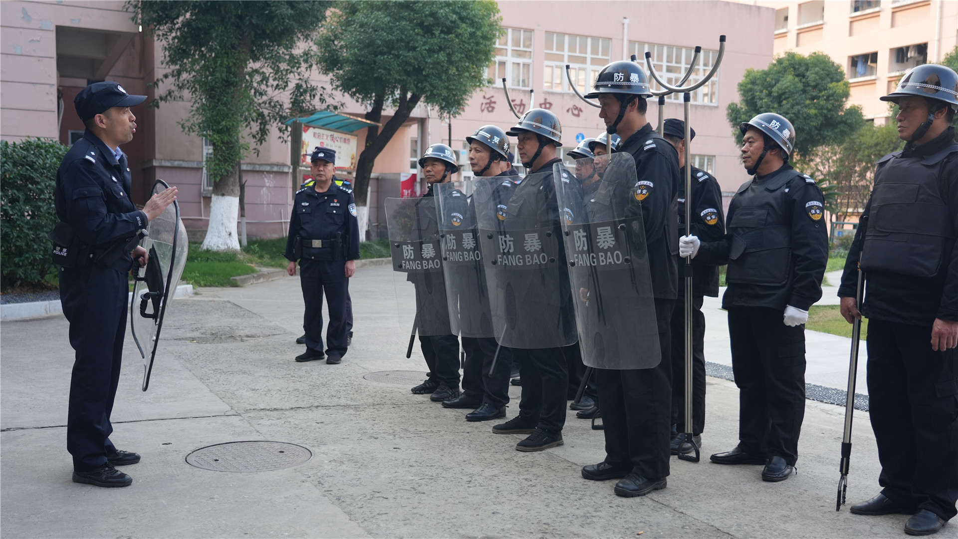 “防爆盾牌要和身体保持一定的距离……”“操作过程中目光要坚定,动作要利索……”杨盛警官在安保技能培训中讲解了盾牌、钢叉、脚叉的使用方法,然后强调有“暴恐分子”时的准备工作以及安保人员要同心协力制止“暴恐分子”进校园。通过培训,锻炼了安保队员的实操能力,提升了安保队伍的整体水平。