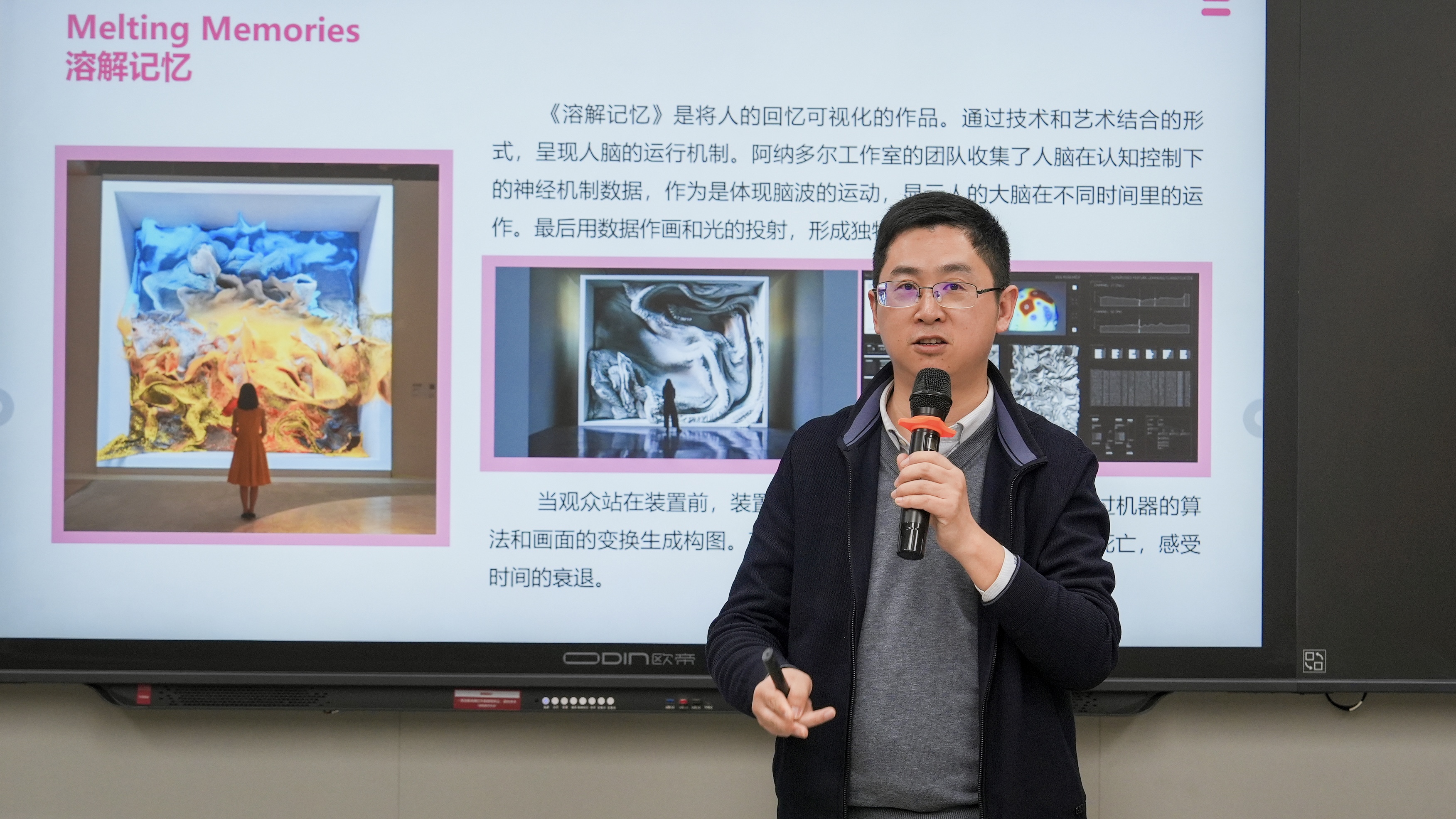 孙峰峰以其深厚的行业背景和丰富的实践经验,围绕艺术与科技的方法论、AIGC赋能的沉浸式交互艺术展、装置艺术作品的创意设计等多个前沿话题进行了深入浅出的讲解。他不仅分享了公共空间数字化、智慧公园和博物馆科技馆数字化展览研发的最新成果,还介绍了自己在教育部全国大学生创业大赛中担任评委的宝贵经验,以及拥有的50多项发明专利和实用新型专利等荣誉。