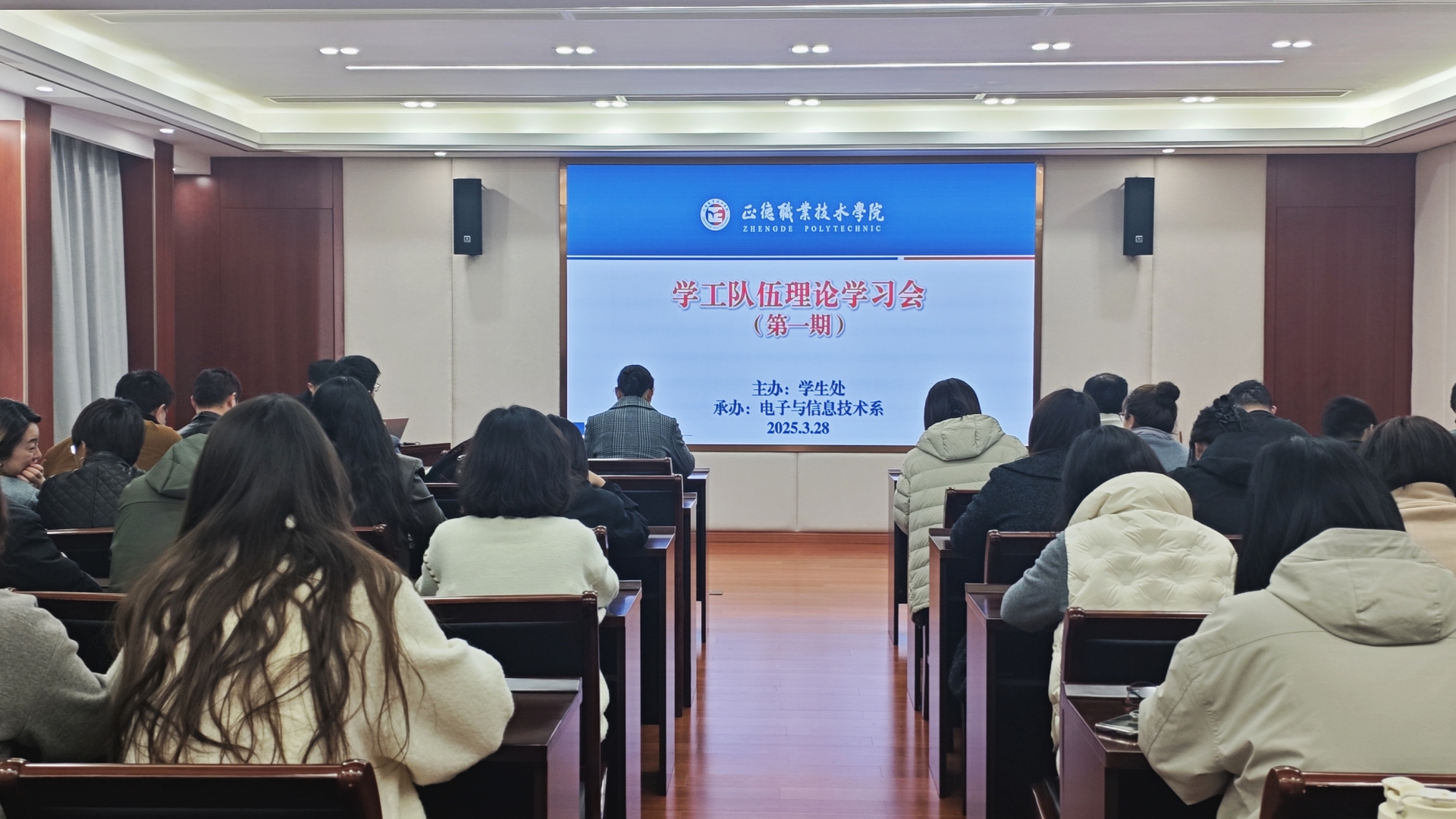 为深入学习贯彻全国两会精神,进一步提升学工队伍的理论素养与创新能力,3月28日下午2点,学院在5201会议室开展2025年第一期学工队伍理论学习会。本次培训邀请到了南京竹影数字科技有限公司创始人、南京多环科技有限公司总经理范玉峰,带来主题为“两会政策引领·AI赋能实践——高校辅导员工作智能化升级策略”的讲座。院党委副书记、副院长梁薇,学生处、团委负责人、各系分管学生工作负责人与全体辅导员参会。会议由学生处处长祝佳俊主持。