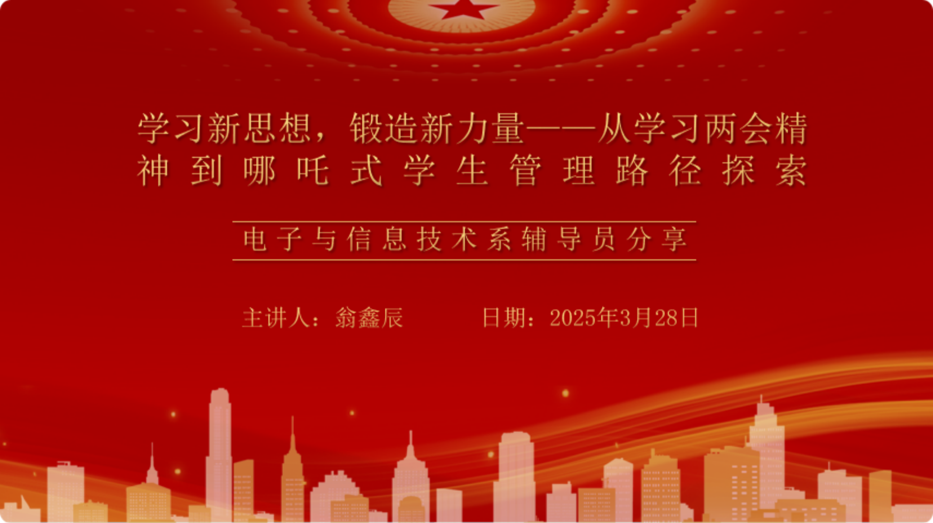 随后,电子与信息技术系辅导员翁鑫辰以“学习新思想,锻造新力量——从学习领会两会精神到哪吒式学生管理路径探索”为题进行了交流发言。作为一名辅导员队伍的新兵,翁鑫辰结合自己六个月以来的工作体会,分享了如何以习近平总书记两会重要讲话精神为指引,探索学生管理工作的新路径。他提出“束之以法、晓之以理、动之以情”的管理原则,并借鉴电影《哪吒2》中的太乙真人形象,阐述了辅导员如何成为学生成长的陪伴者和知识技能的传授者。翁鑫辰的发言内容充实、情感真挚,引起了辅导员们的强烈共鸣。