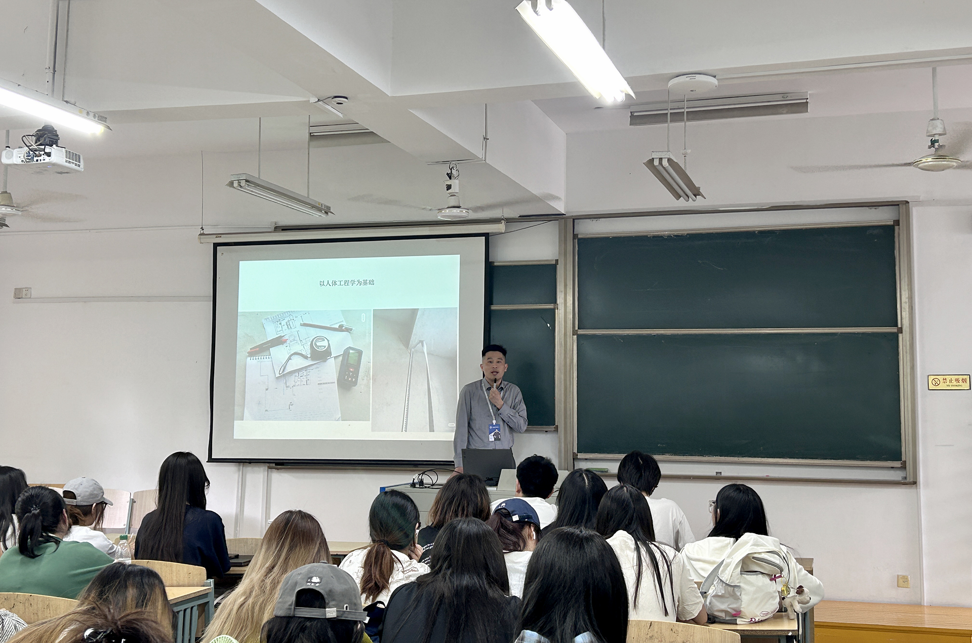 聘任仪式后,梁东海为建筑室内设计、环境艺术设计专业2023级、2024级学生带来了一场题为“设计师成长路径与职业发展”的专题讲座。通过丰富的家装设计案例,系统讲解了家装设计流程、方法理念及细节要素等专业知识。在讲解人体工程学知识时,他现场示范家具尺寸测量技巧,以沉浸式教学方式引导学生互动思考,生动的案例解析使同学们对户型改造技巧和设计风格的理解更加深入透彻。