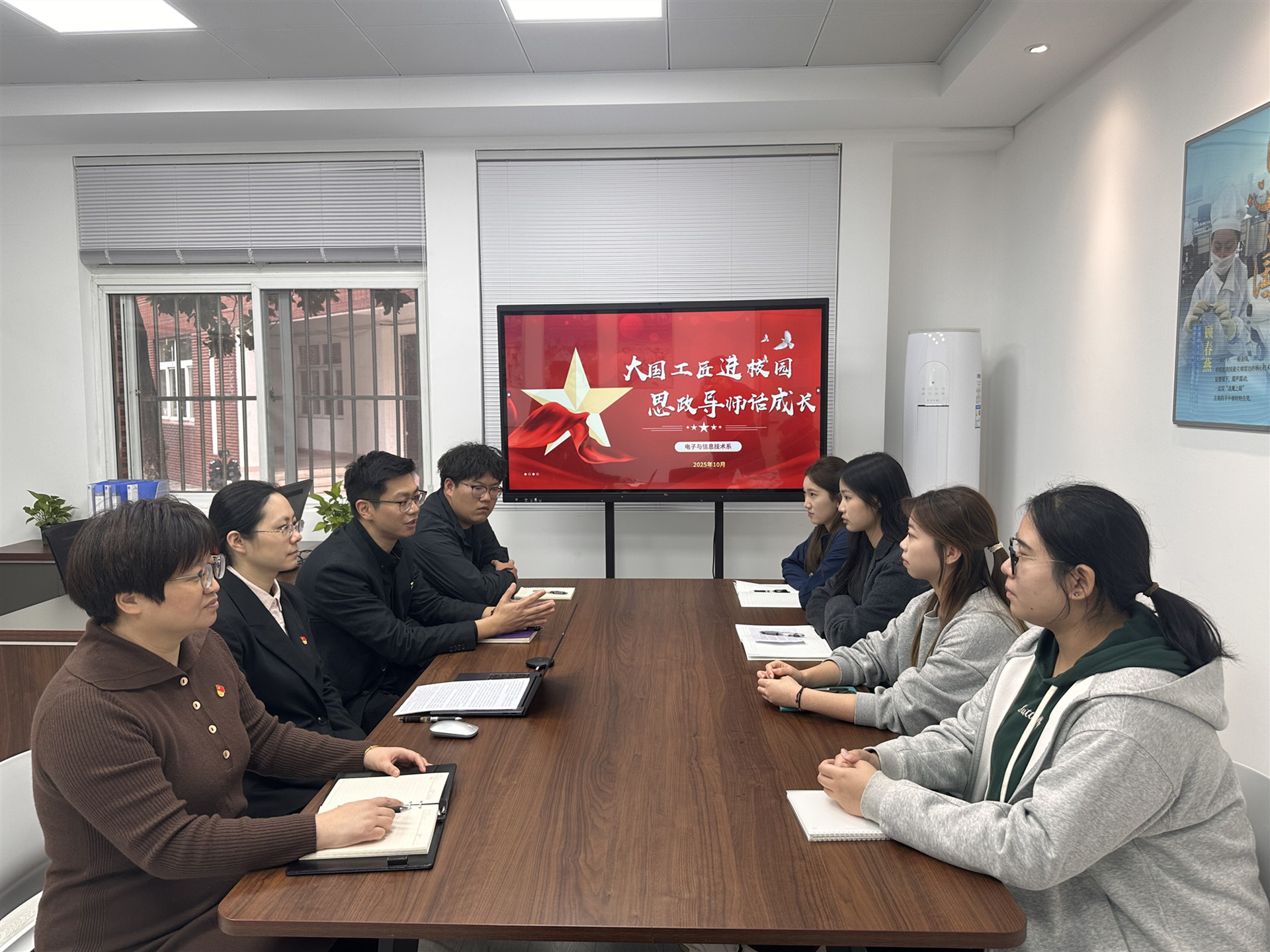 为进一步弘扬劳模精神、劳动精神、工匠精神,提升学生职业素养,10月27日下午,电子与信息技术系在大国工匠工作室举办“大国工匠进校园,思政导师话成长”活动。电子与信息技术系党支部书记、副主任赵欣,电子信息工程技术专业负责人戴慧以及电子信息工程技术专业的学生代表共同参加了此次活动。