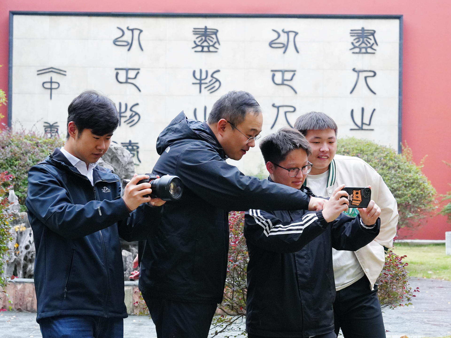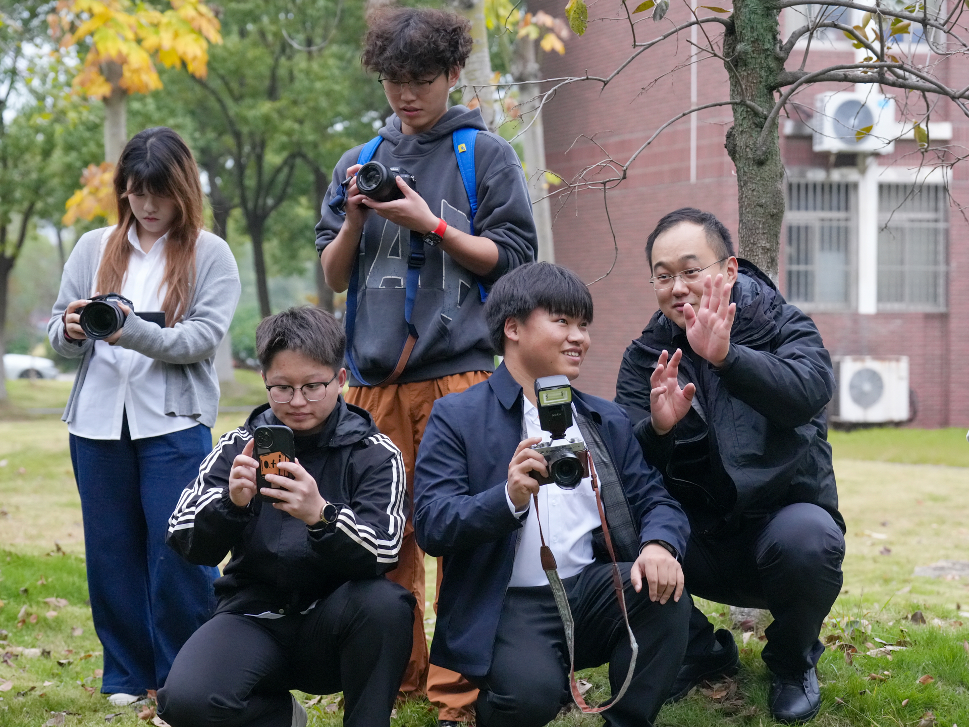 讲座结束后,张正带领同学们在校园里进行实践拍摄,针对构图技巧、光线运用以及设备操作等方面进行详细指导。在作品点评环节中,张正对同学们的拍摄水平表示肯定,同时对每位同学照片中存在的问题进行了分析并提出改进方法,活动现场气氛高涨,掌声与笑声此起彼伏。师生们在问答环节中畅所欲言,思想的火花在交流与碰撞中频频闪现。