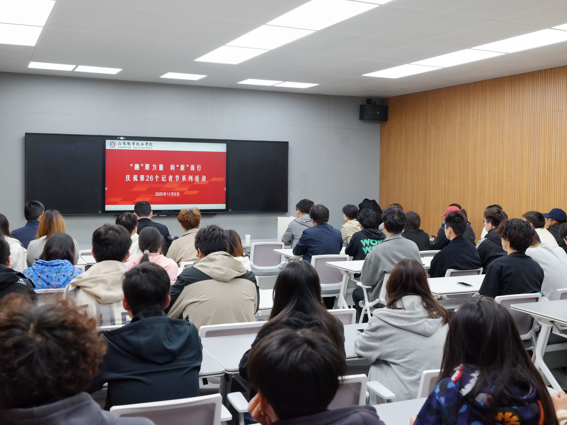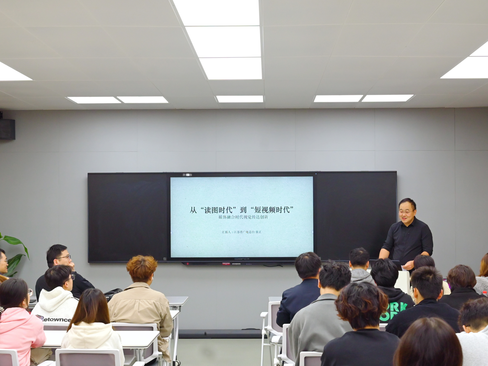 在第26个中国记者节来临之际,为展现校园媒体人的风采,激发同学们的新闻理想与实践热情。11月6日,学院党群工作部联合艺术设计与建筑工程系在9106教室举办“‘融’聚力量,向‘新’而行”记者节主题活动。活动特邀江苏省广播电视总台户外露出主任记者张正来户外露出 开展主题讲座。艺术设计与建筑工程系主任周卫、党群工作部部长祖国、艺术设计与建筑工程系教师葛雯和王子烜、院新媒体中心和融媒体技术与运营专业学生参加此次活动。活动由党群工作部副部长郑瑞主持。