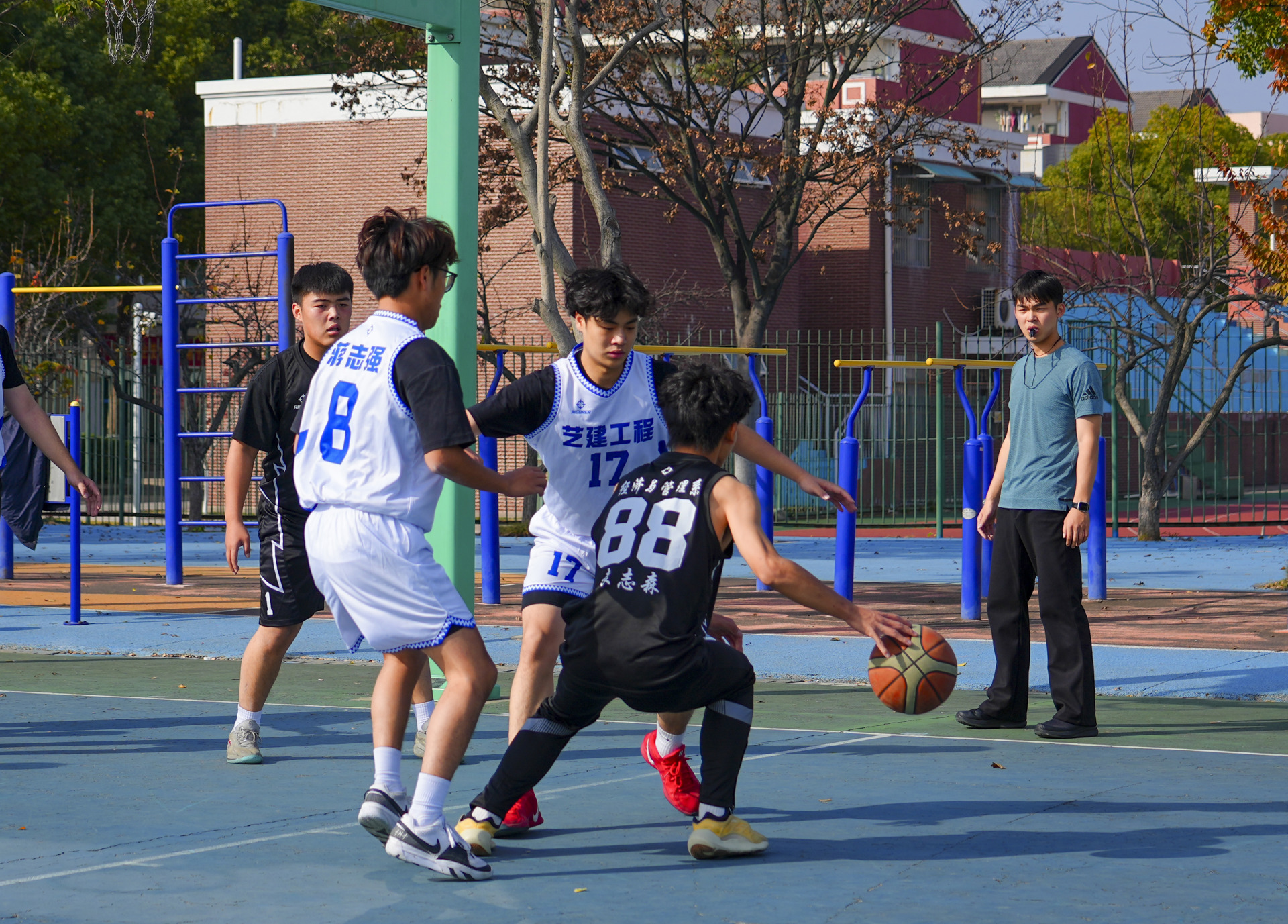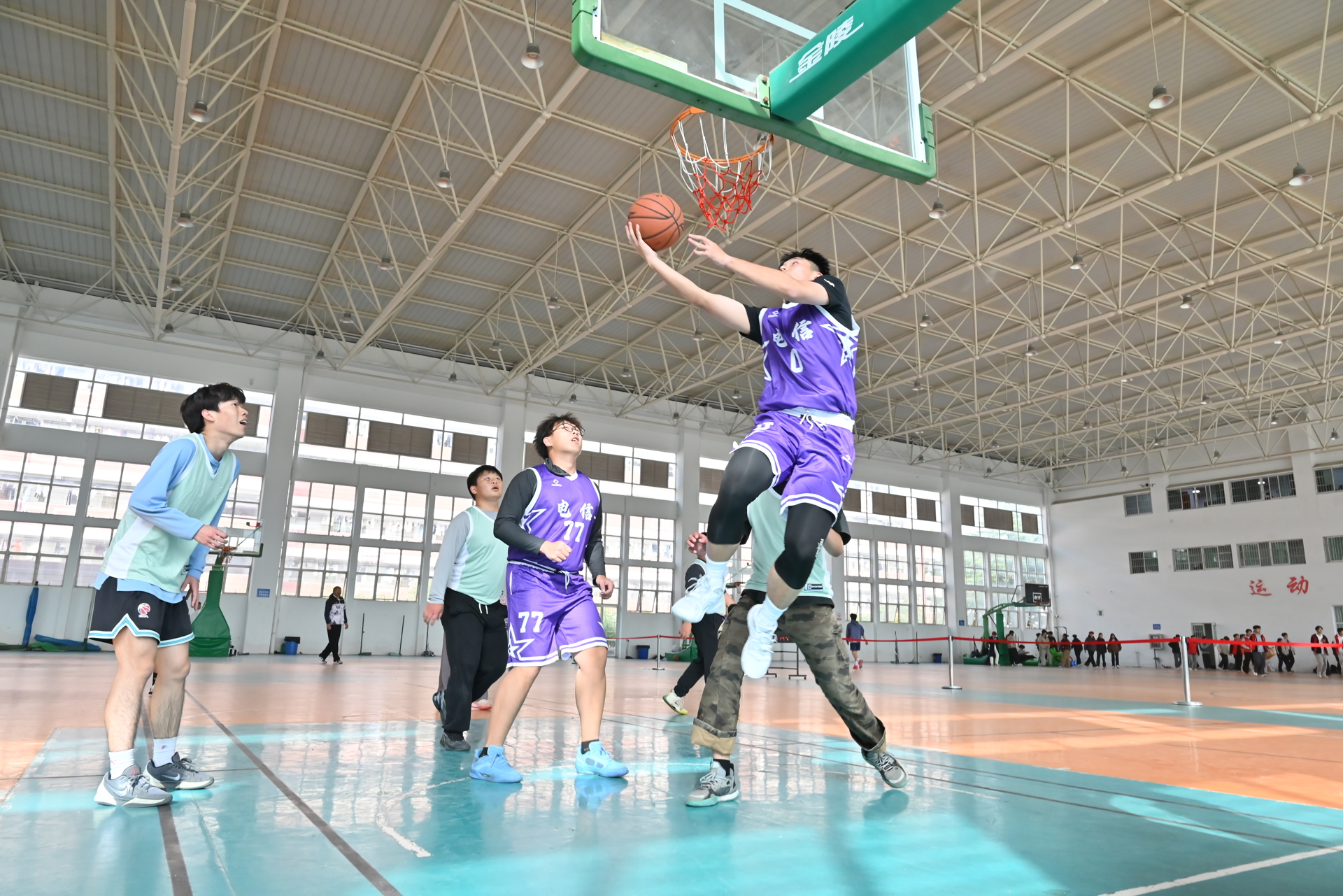 赛场上,各系参赛队伍怀揣热爱登场,队员们默契配合、攻防兼备,每一次精准传球都是信任的传递,每一次奋力起跳都藏着对胜利的执着,每一次严密防守都尽显团队凝聚力,他们灵活的运球、精准的投篮、巧妙的传球,一次次将比赛推向高潮。