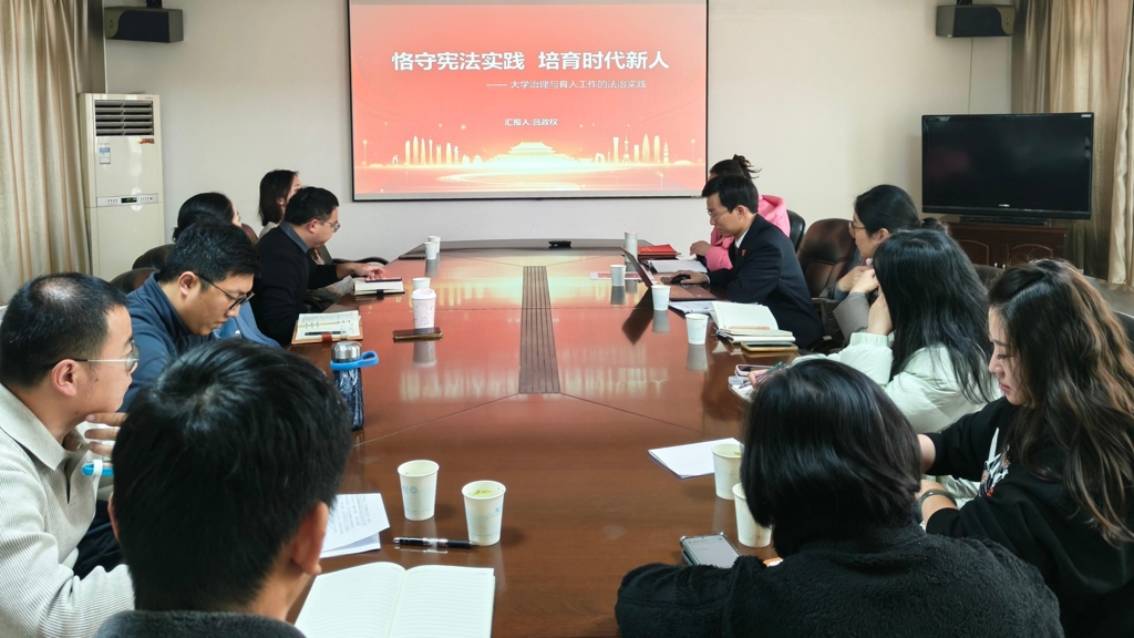为深入学习贯彻习近平法治思想,持续推进校园法治建设,12月17日下午,户外露出 机关第五党支部在行政楼二楼会议室举行宪法专题学习活动,特邀江宁区人民检察院第二检察部四级检察官助理吕政权同志讲授《恪守宪法实践 培育时代新人》专题党课。活动由党支部书记祝佳俊主持,学院党委副书记、副院长梁薇出席本次活动,支部全体党员、思政课教师和辅导员代表参加学习。