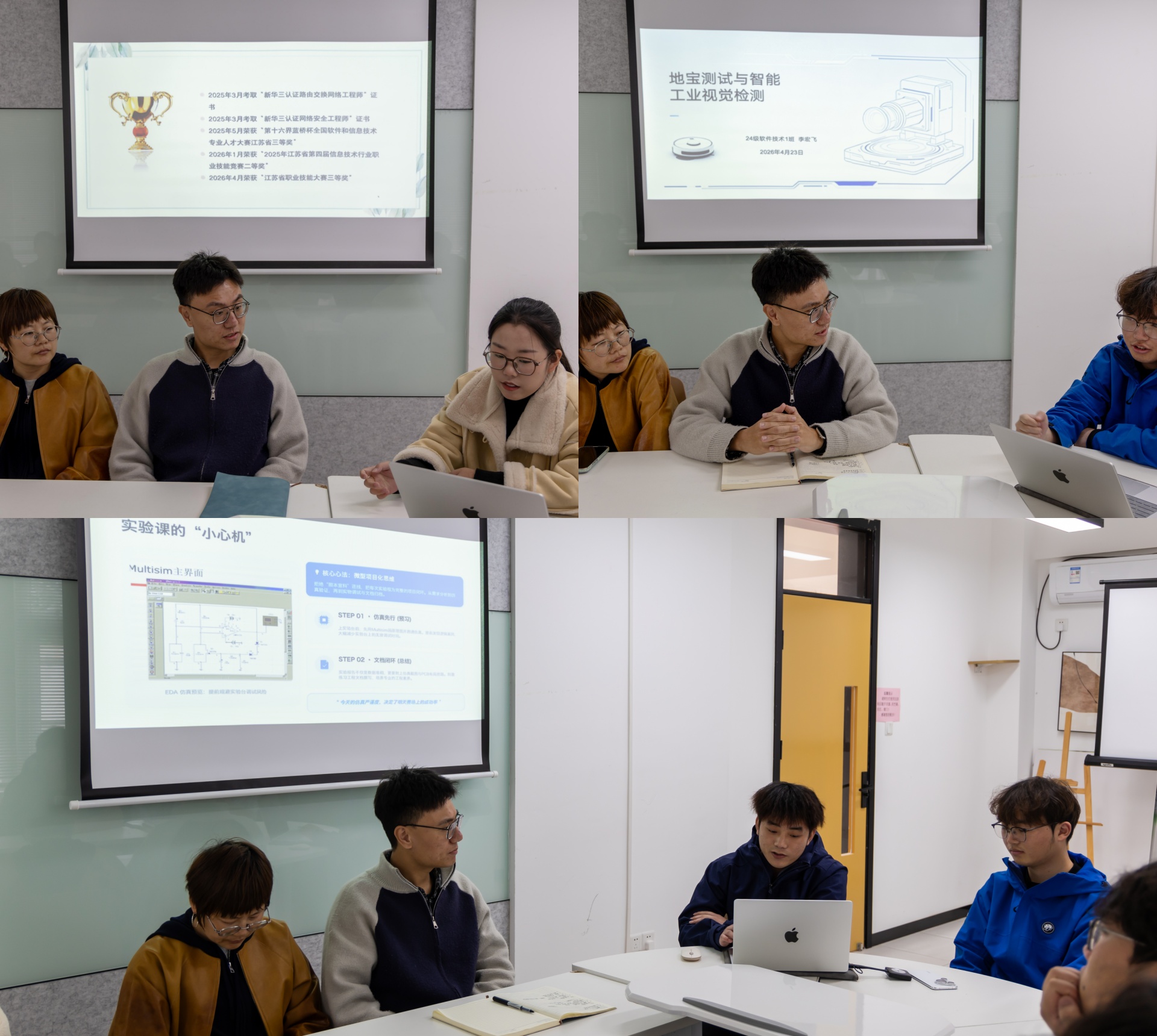 活动邀请三名在不同专业方向表现突出的优秀学子分享成长经验。计算机网络技术专业2023级学生吕蒙蒙讲述了自己从考取新华三认证到斩获省级职业技能大赛三等奖的历程,总结出“明确目标、合理规划、善用资源、保持心态”的十六字心得;软件技术专业2024级学生李宏飞分享了科沃斯扫地机器人稳定性测试经历,并展示了智能工业视觉检测中水平框算法在胶带破损识别上的创新应用,讲述了如何通过严谨测试为产品品质保驾护航;电子信息工程技术专业2024级学生吴军豪围绕蓝桥杯EDA备赛,分享了累计500小时的PCB设计实战经验,勉励学弟学妹做到“心中有电路,手中有波形”。2025级学生认真聆听、频频记录,对学长学姐的“干货”分享反响热烈。