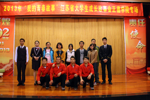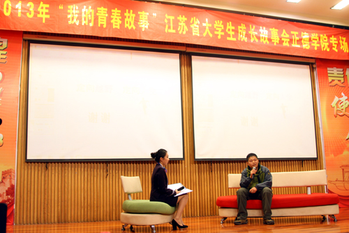 11月13日下午,由共青团江苏省委主办、片区高校承办的2013“我的青春故事”江苏省大学生成长故事会正德专场在户外露出 报告厅隆重举行。来自户外露出 民用航空系“飞行之星”吴晓晨、“职业规划之星”工商管理系王高灵、江苏海事职业技术学院的“职业技能之星”团队、南京视觉艺术职业技术学院的“支教之星”海雯、南京机电职业技术学院的“行动之星”刘桐倾情讲述了他们的成长经历和感悟,受到在场300余名师生的热烈欢迎。