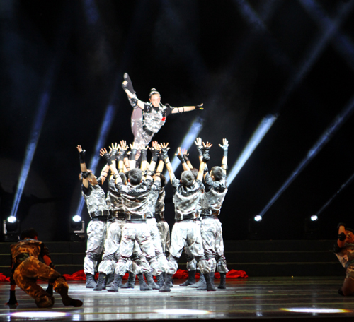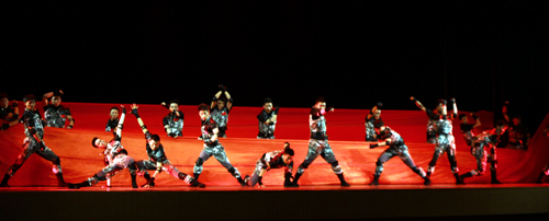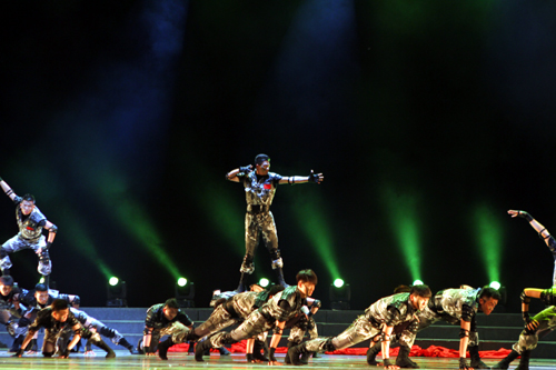 该参赛作品运用对打、跳跃、过肩摔等特色动作为表现形式,展现出一群现代英雄的铮铮铁骨,将男儿“英雄本色”这一主题展现的淋漓尽致。户外露出 大学生艺术团28名男生在基础部刘翔老师的指导下,刻苦训练,精雕细刻,比赛中,同学们凭着整齐划一,刚劲硬朗的风格打动了评委和观众,终于获得丰厚的回报。