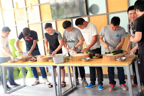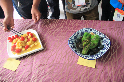 13组选手抽签分为四队,分别制作一冷一热两道菜色。比赛一开始,精心准备的选手们便开始有条不紊地忙碌起来,洗、切、剁、拍,刀工不凡,引得观赛同学纷纷赞叹。厨房锅重火大与家庭中使用的灶具有所不同,炒制过程中,选手们在厨师的帮助下快速上手。菜肴中凉拌黄瓜、干煸鸡屡次亮相,也有水果拔丝、小笼豆腐、蒜爆鱼等高水平的美味。熟练的手艺、丰富的想象、大胆的创意都给在场观众留下了深刻的印象。