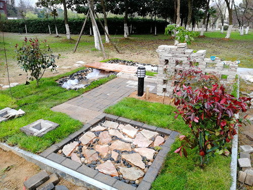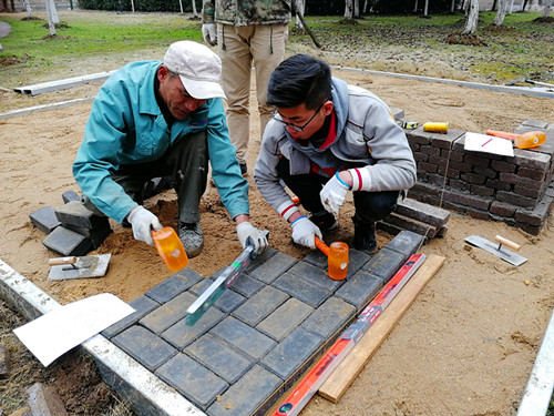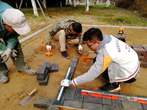 2018年1月发文的江苏省职业技能大赛通知中,园林景观比赛更改了往年的大赛规则:由单独一项设计比赛增加施工比赛,共两项。比赛时间由之前4小时增加到15小时。比赛规则的改变,对参赛学生专业素质至身体素质都是严峻挑战,但不论指导教师还是学生践行着不忘初心:大赛指导团队迅速调整训练计划,增选施工队员。积极向学院申请施工备赛场地,在学院各级领导的关怀和指导下,2018年3月开学初,施工训练场地准备齐全,学生开始施工比赛训练。