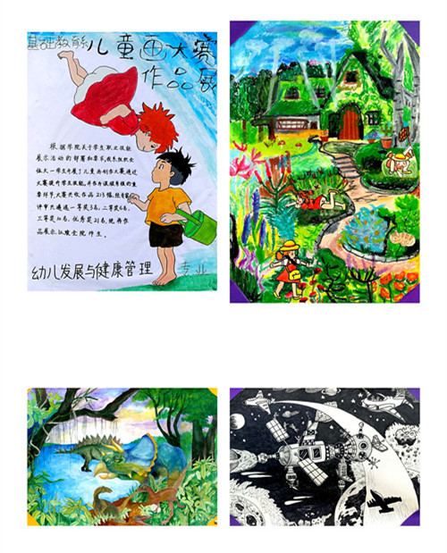 儿童画是幼教专业技能之一。此次活动亦作为课程考核的重要环节,要求学生采用水彩画、水粉画、丙烯画、水墨、蜡笔等,或结合黏土、彩卡纸等手段,从《美丽的家园》场景篇、《有趣的恐龙》动物篇、《神奇的太空》想象篇中任选一个主题进行创作。该系同学积极参与,共收到作品213幅。