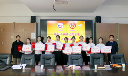颁奖仪式上,钱金龙团长对订单班过去一年的工作进行了回顾,对同学们的辛勤付出及取得的成绩予以肯定;王国峰总裁宣读了《关于表彰舞蹈订单班优秀学生的决定》,经过校企双方的共同评定,张洁等9名同学获得了由金箔文产集团颁发的各等级奖学金。詹勇虎主任、王国峰总裁为获奖学生颁发了奖学金和荣誉证书。