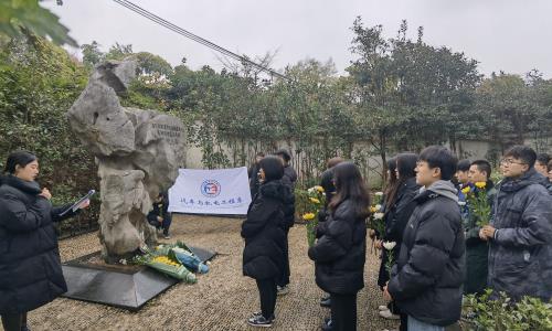 学生代表集体低头默哀一分钟表达对殉难同胞的哀悼,并分别绕墓碑为死难者敬献花圈。