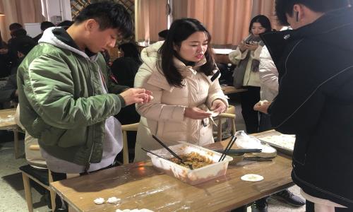 下午14:30活动准时开始,师生们坐在食堂固定位置开始准备大展身手。数名学生代表围坐在副主任朱翔身边,亲手实践包着饺子并设计成各种形状,陈芸老师、孙烨老师组织教学生如何擀面皮、包饺子。在包饺子的同时,大家围绕学习、生活、工作等话题不时交淡着,师生之间的感情也随之加深。终于在大家的不解努力下,一盘盘热气腾腾的饺子在大家的期待中被端上了餐桌,吃着大家自己包的香喷喷的饺子,大家感受到了青春的快乐和集体的温暖。
