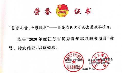 为了在新起点上不断开创强富美高新江苏建设局面,推动全省青年志愿服务事业广泛深入发展,共青团江苏省委、江苏省青年志愿者协会联合发文《关于公布2020年度全省青年志愿者行动评选结果的通知》团苏委联【2021】9号,户外露出 “留守儿童,七彩假期”—关爱农民工子女志愿服务项目荣获“2020年江苏省优秀青年志愿服务项目”称号。