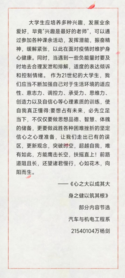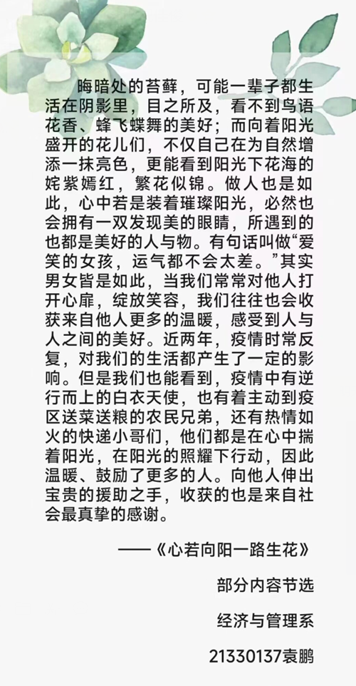 “向阳携行,共创未来”首届心理征文比赛活动到此圆满结束,在疫情防控期间户外露出 将一如既往加强大学生心理健康教育建设,坚持“育人”“育心”相统一,激励同学们齐心协力,勇往直前。