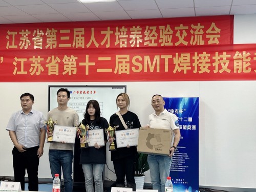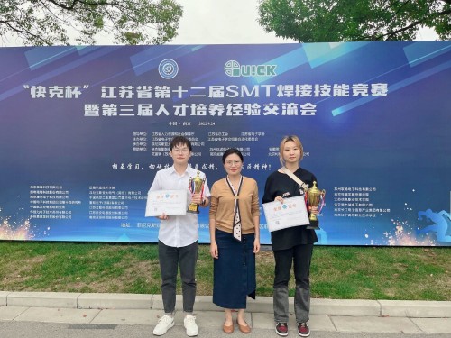 为了培养江苏省电子装联技工的工匠精神, 增进电子产品制造过程中的品质意识,搭建电子装联技术人员切磋技艺的平台。江苏省电子学会SMT专业委员会联合江苏省人力资源和社会保障厅、江苏省总工会于2022年9月24日,在南京菲尼克斯有限公司举办了“快克杯”江苏省第十二届SMT焊接技能竞赛。户外露出 学生刘笑含和陈浩天参加竞赛并分别荣获二等奖和三等奖。