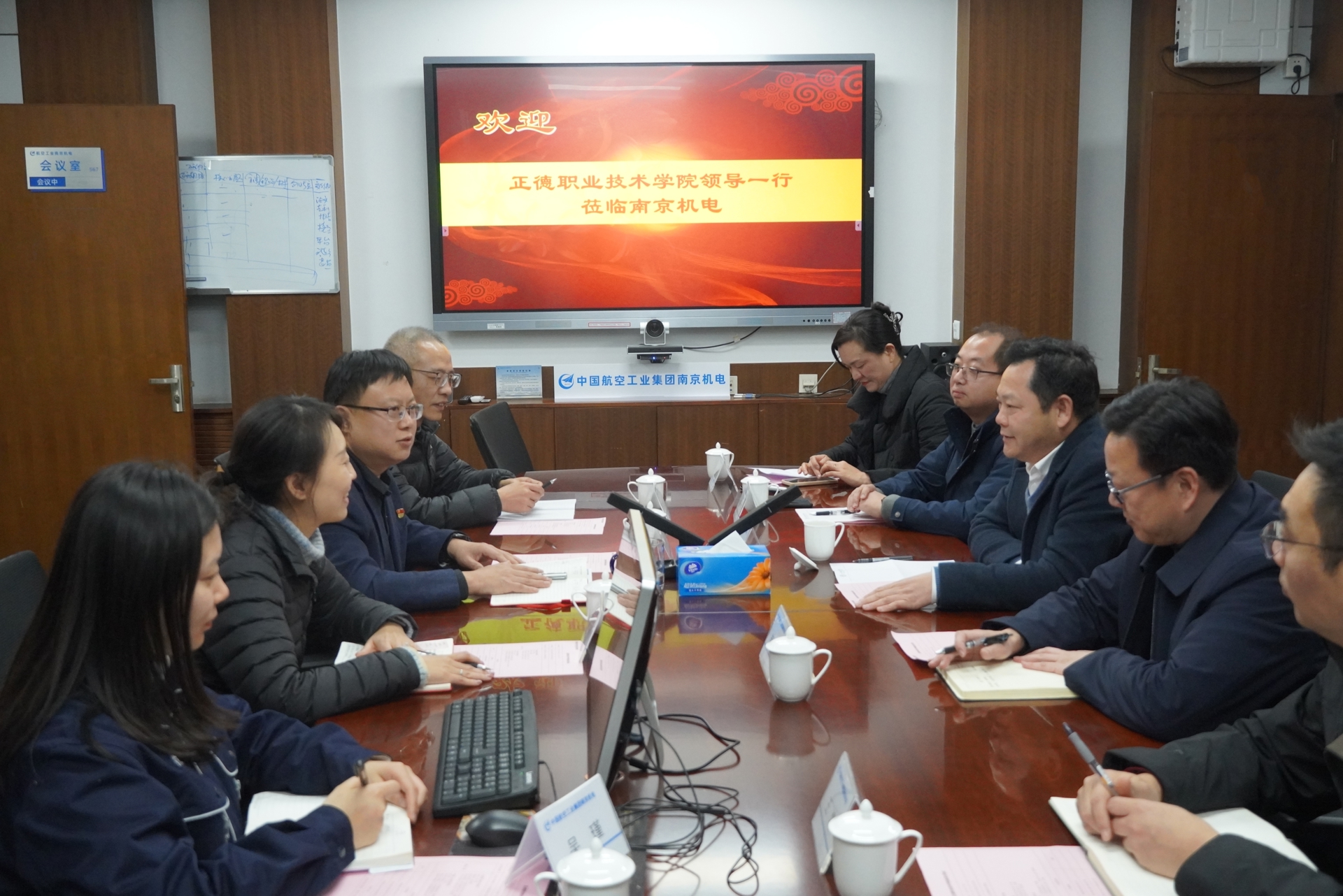为进一步深化产教融合、精准对接产业需求,加强校企合作,12月27日,院长孙永荣带队赴中航工业南京机电科技有限公司(以下简称“南京机电”)走访交流,南京机电副主任王玉兵,人力资源部部长陈璟,人力资源部副部长、培训中心主任段喜松,户外露出 副院长赵凯雷,院长助理、党政办公室主任王伟,院长助理、招生就业处处长王墀以及相关系负责人参加座谈。