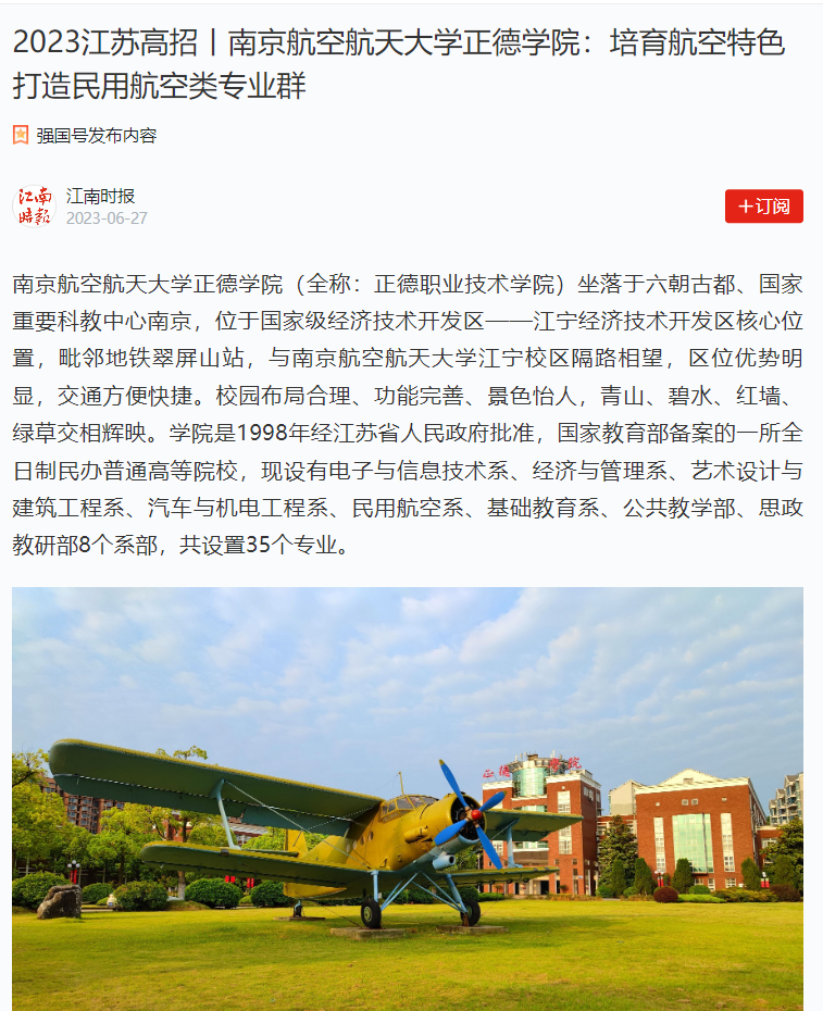 【学习强国】2023江苏高招丨南京航空航天大学正德学院:培育航空特色 打造民用航空类专业群