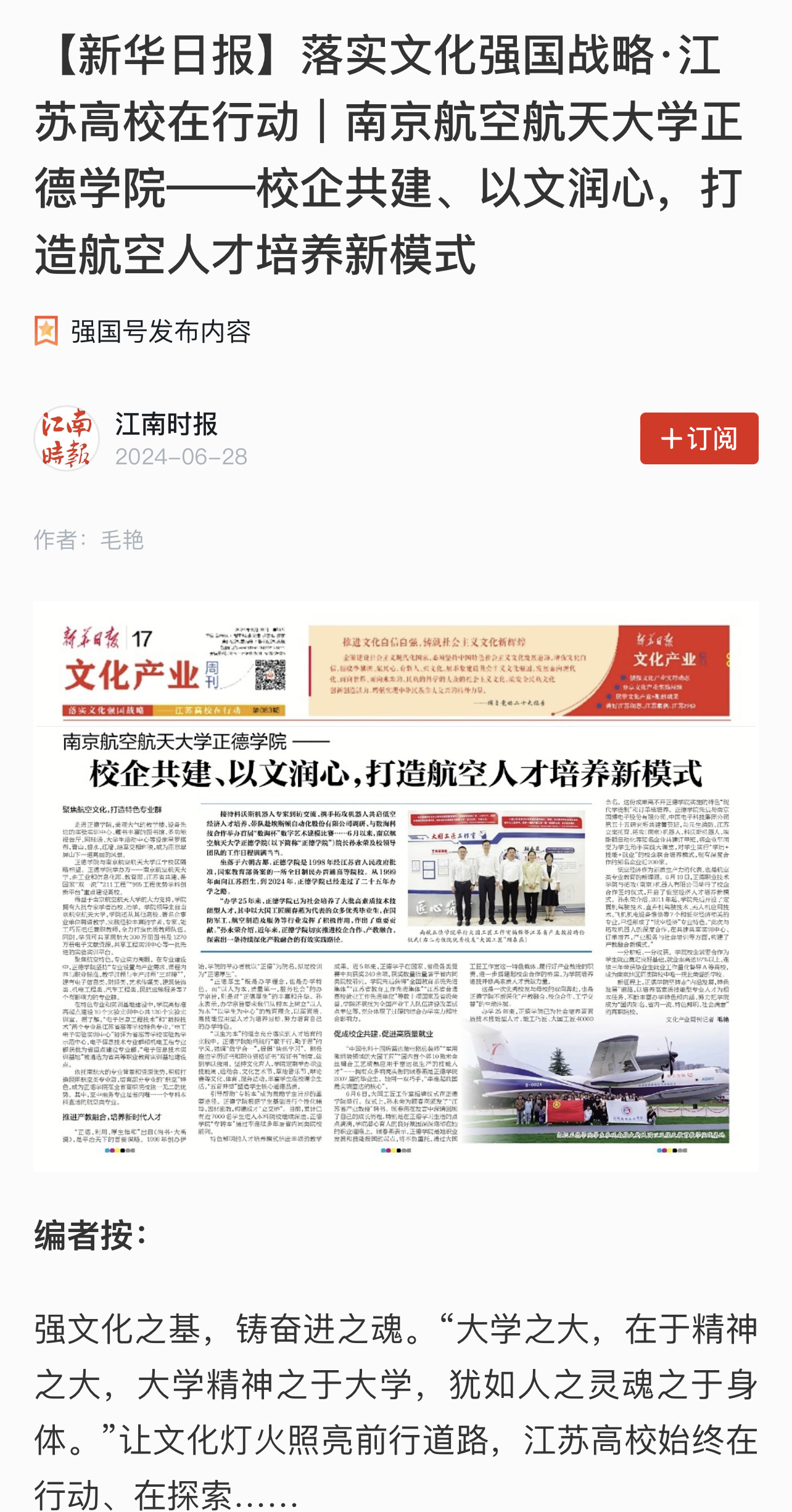 【新华日报】落实文化强国战略·江苏高校在行动|南京航空航天大学正德学院——校企共建、以文润心,打造航空人才培养新模式