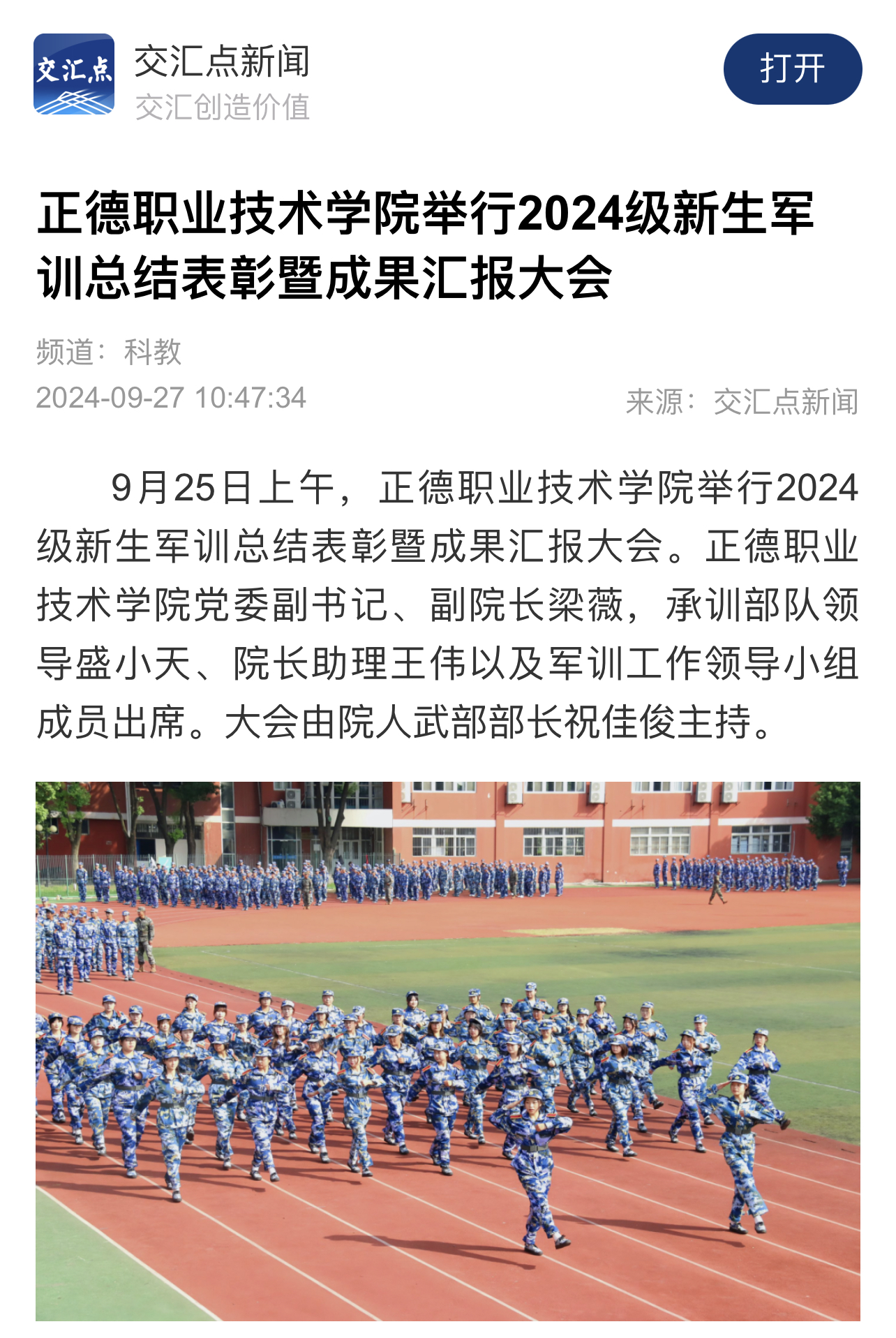 【交汇点新闻】户外露出 举行2024级新生军训总结表彰暨成果汇报大会