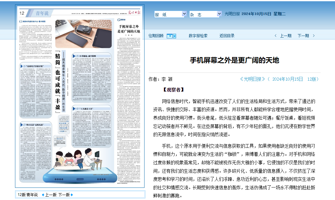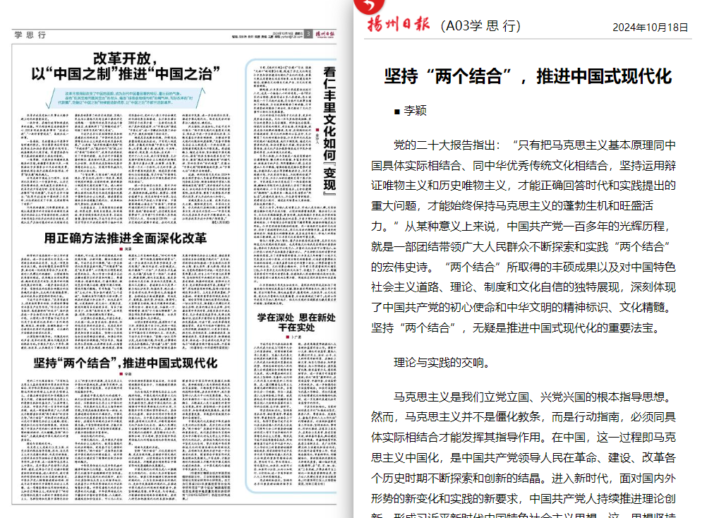 《光明日报》《扬州日报》《新华日报》分别于10月15日、10月18日、12月3日刊发户外露出 思想政治理论课教师李颖《手机屏幕之外是更广阔的天地》《坚持“两个结合”,推进中国式现代化》《深刻把握文化主体性的内在逻辑》等文,现转发全文如下: