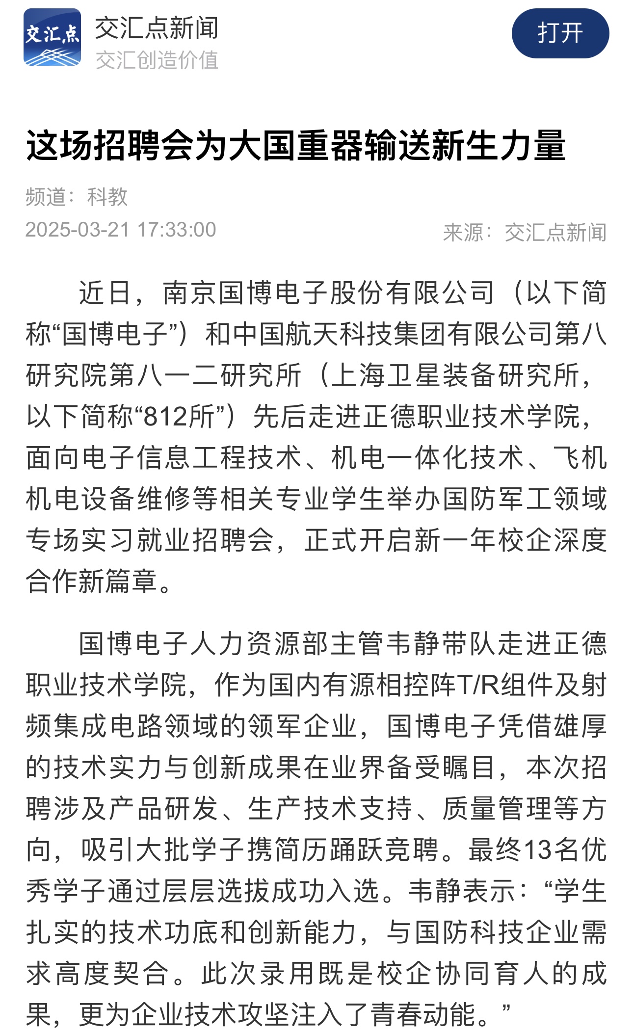 【交汇点新闻】这场招聘会为大国重器输送新生力量